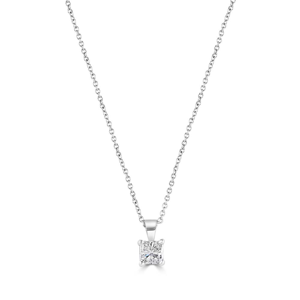 Elevate your elegance with this exquisite 18ct white gold pendant, featuring a stunning princess cut diamond securely set in a classic four-claw setting. The pendant is gracefully suspended on a delicate 18ct white gold 16" trace chain, making it a perfect blend of sophistication and timeless beauty. With a total diamond weight of 1.06ct, this piece is designed to dazzle and delight.