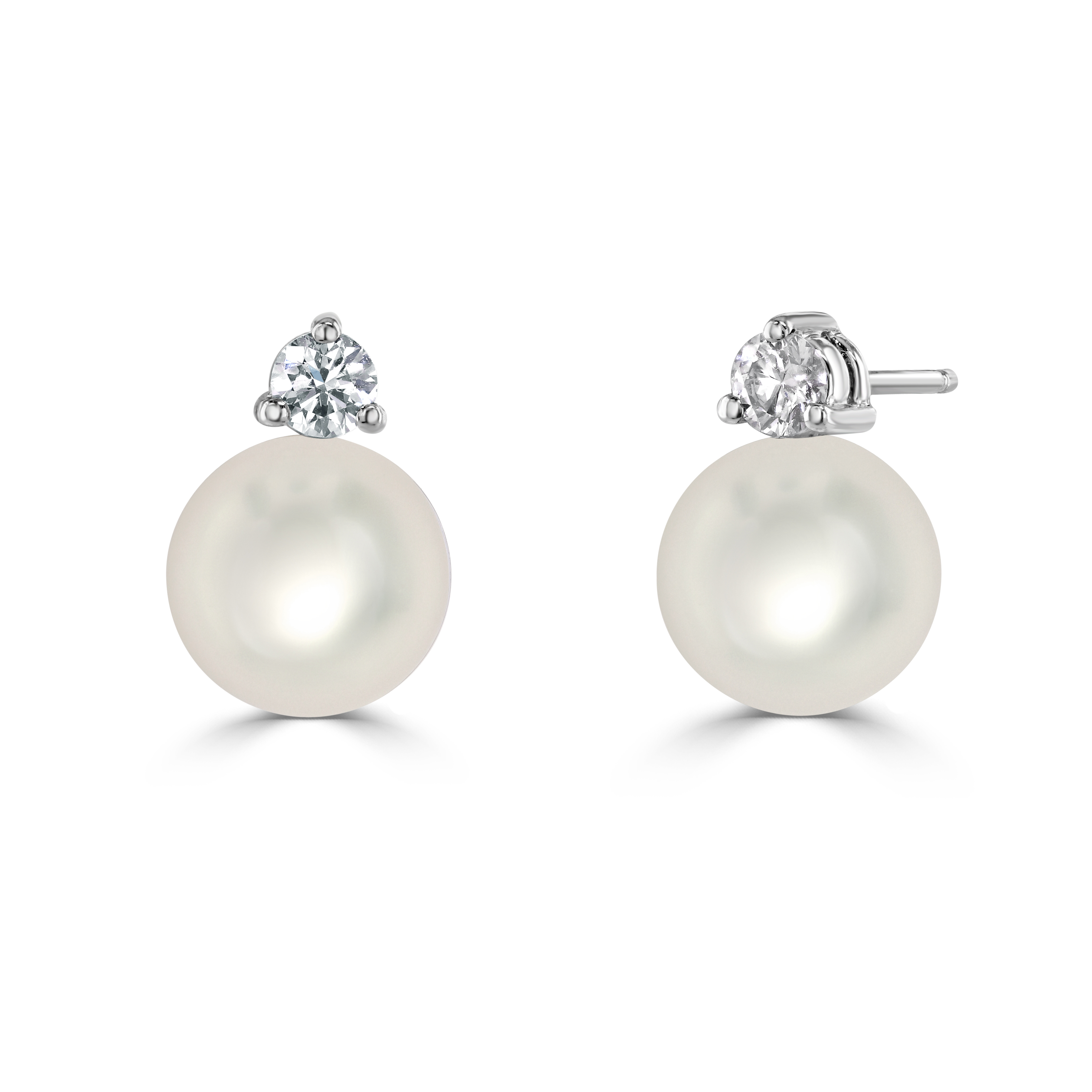 These graceful stud earrings have a white gold claw set round brilliant cut diamond above an alluring South Sea cultured pearl. Other sizes and variations are available, please contact the store for more details.