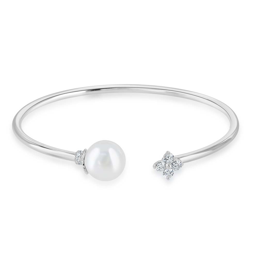 A modern twist on classic elegance, this 18ct white gold torque-style bangle features a single South Sea pearl (10.5–11.0mm) as its centrepiece, radiating natural beauty and sophistication. Surrounding the base of the pearl are micro-set round brilliant-cut diamonds, adding a delicate sparkle. At the opposite end, four claw-set round brilliant-cut diamonds provide a perfect balance of brilliance and refinement. With a total diamond weight of 0.47ct, this piece is a true statement of luxury and craftsmanship. Combining the luminous beauty of a South Sea pearl with the sparkle of diamonds, this bangle is designed for those who appreciate bold elegance and timeless sophistication. Perfect for special occasions or as a signature piece in your collection.
