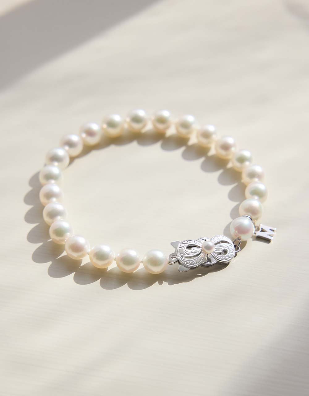 This exquisite 7-inch strand features 22 Akoya cultured pearls, each carefully selected for its lustrous sheen and flawless round shape. These pearls, known for their exceptional quality and timeless elegance, are strung together to create a classic and sophisticated look. The strand is secured with an 18ct white gold clasp, which is not just a functional piece but a statement of luxury in itself. This clasp is a signature feature of Mikimoto, a mark of authenticity and craftsmanship that distinguishes this piece as a product of one of the world's most renowned pearl specialists. The combination of the radiant Akoya pearls with the sleek and polished white gold clasp creates a piece of jewelry that is both understated and opulent, perfect for adding a touch of grace and refinement to any outfit.