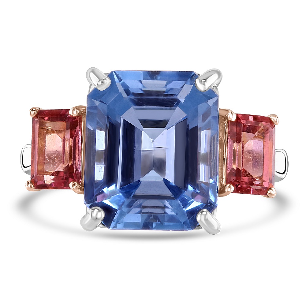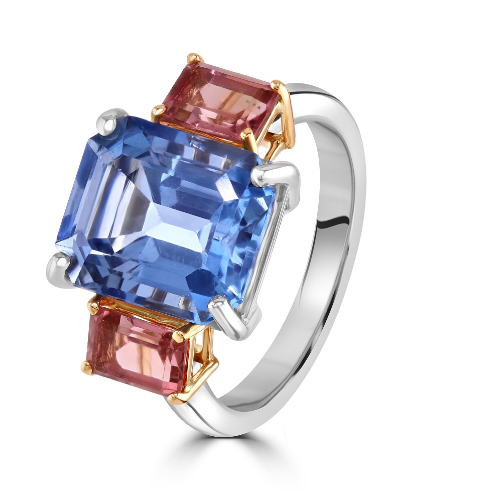 Discover the epitome of elegance with our stunning 18ct white and rose gold trilogy Ring, featuring a breath taking centre octagon cut Blue Topaz, securely held by four claws, and flanked by two equally mesmerizing octagon cut Pink Tourmalines, each also claw set. The Blue Topaz, weighing an impressive 7.0ct, radiates a serene blue hue, symbolizing tranquillity, and calmness. Complementing this, the Pink Tourmalines on either side have a combined weight of 1.20ct, adding a touch of warm vibrancy and sophistication to the piece. This exquisite ring perfectly blends the contemporary allure of white and rose gold, creating a harmonious and captivating look that's both timeless and modern. Crafted for those who appreciate the beauty of coloured gemstones framed in luxurious gold, this ring is a masterpiece of craftsmanship and style. Make a statement of refined elegance with this unique three-stone ring, where the contrasting colours and the brilliance of the gemstones come together to create a piece of unmatched beauty and allure.Top of Form