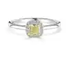 A stunning 18ct white gold cluster ring, an exquisite showcase of luxury and sophistication. This elegant ring features a captivating centrepiece: a 0.36ct cushion-cut yellow diamond, magnificently set in a four-claw 18ct yellow gold setting. The warm hues of the yellow diamond create a striking contrast against the sleek 18ct white gold band.