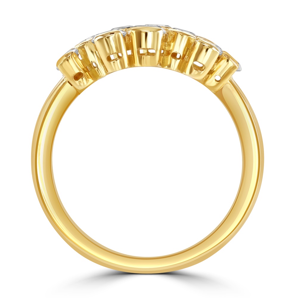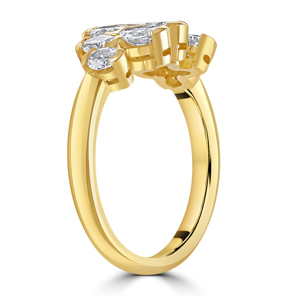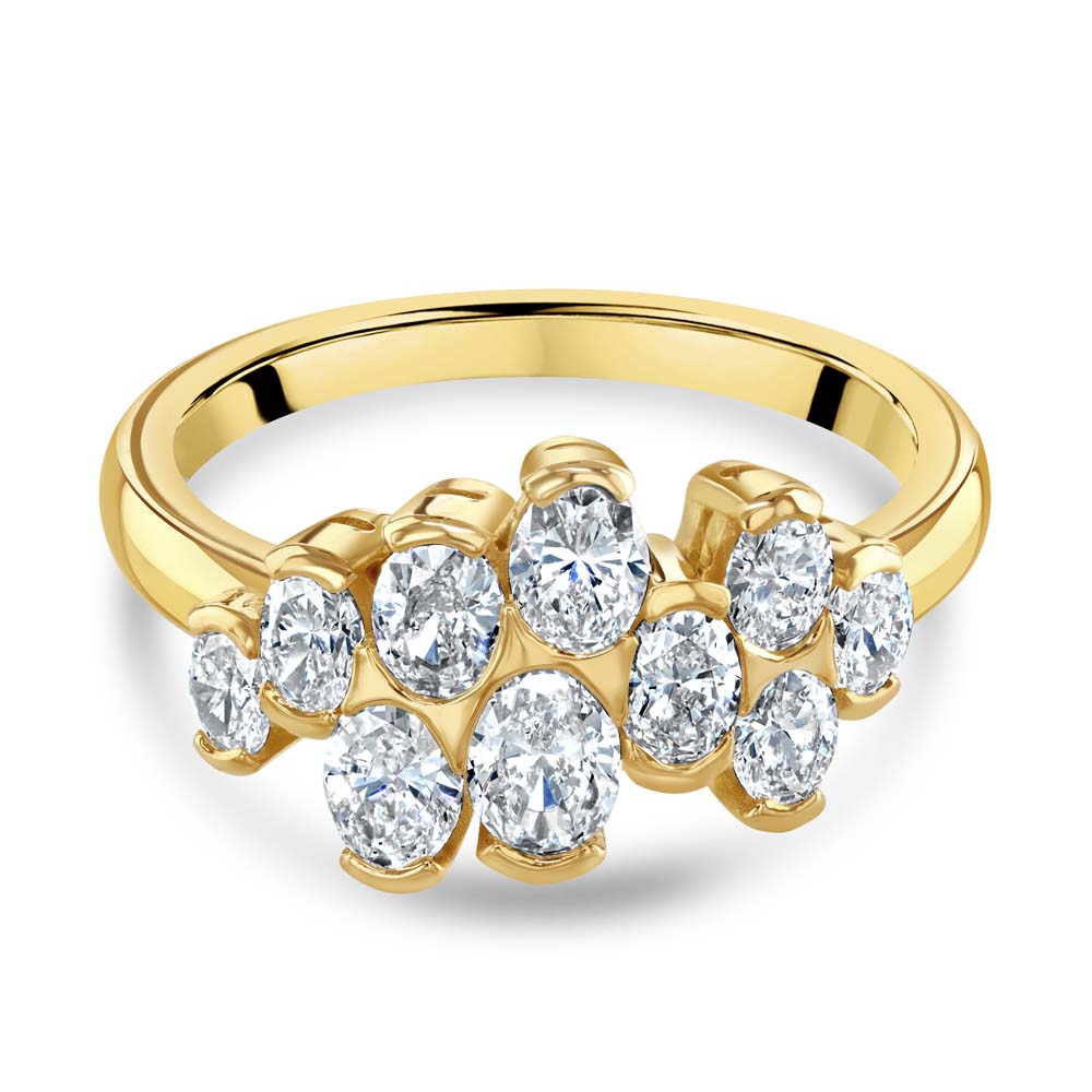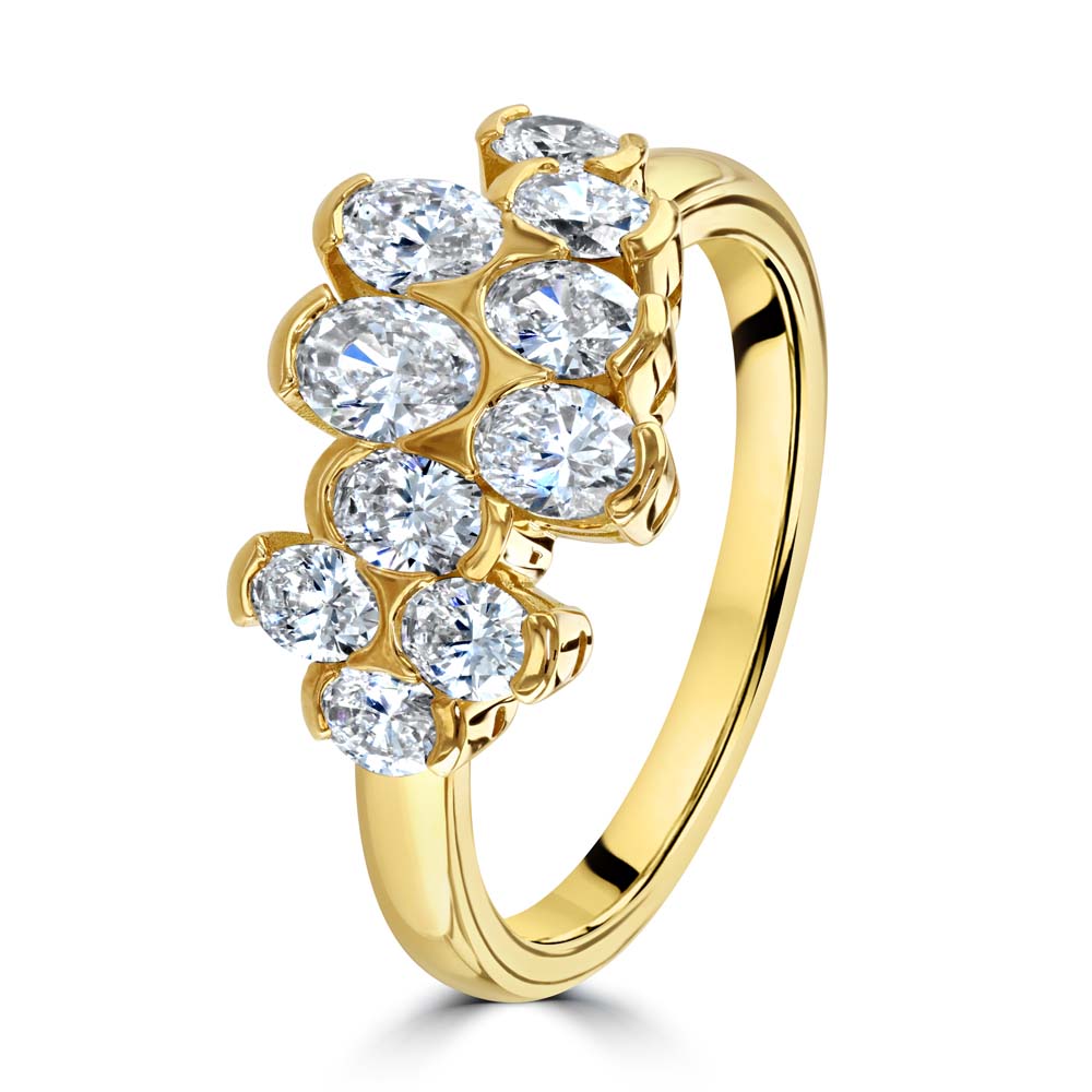 Celebrate bold elegance with this striking bubble-style ring, expertly crafted in 18ct yellow gold and adorned with ten oval-cut diamonds of varying sizes. Each diamond is part rubover set, creating a fluid, sculptural design that radiates modern luxury and timeless charm. With a total diamond weight of 1.41ct, and FG colour / VS-S clarity, this ring offers exceptional brilliance and superior quality. The organic arrangement of diamonds gives the piece a playful yet refined character, making it a perfect statement ring for those who appreciate distinctive, high-end jewellery. Ideal for special occasions or everyday luxury, this diamond bubble ring is a celebration of craftsmanship, individuality, and radiant beauty.