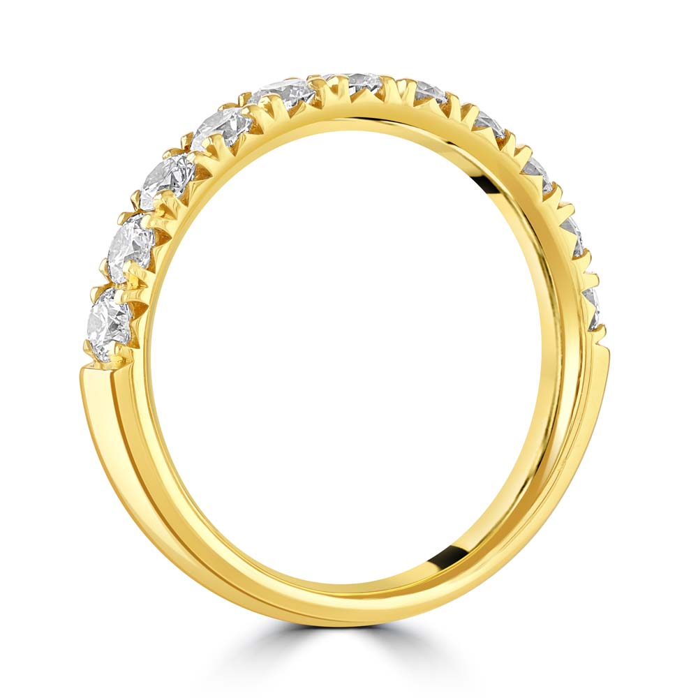 Indulge in timeless luxury with this 18ct yellow gold half eternity ring, featuring eleven round brilliant-cut diamonds in an elegant claw setting. Designed to maximize brilliance and light reflection, this ring offers a perfect balance of sophistication and sparkle. With a total diamond weight of approximately 0.86ct, each diamond is graded G colour and VS2 clarity, ensuring exceptional quality and radiance. Ideal as a wedding band, anniversary ring, or a statement stacking piece, this design embodies classic elegance with a modern touch.