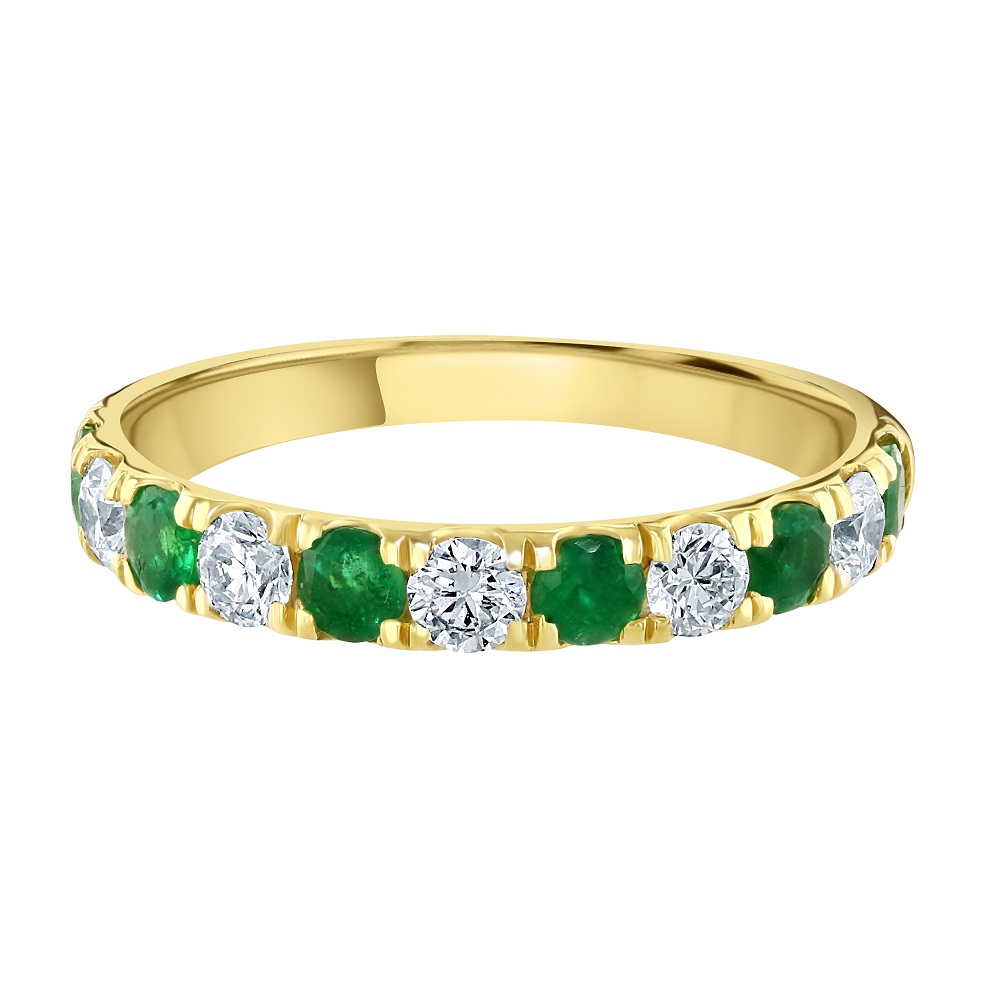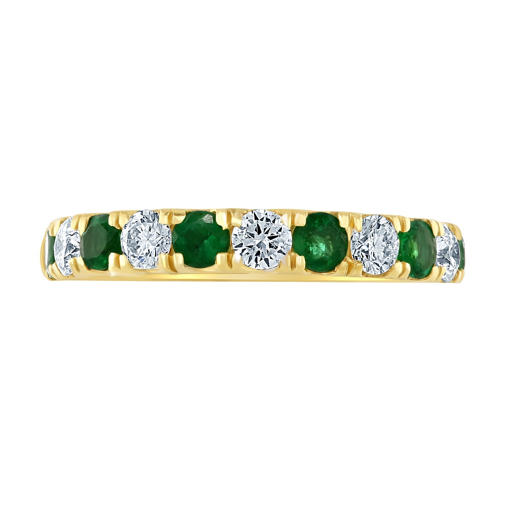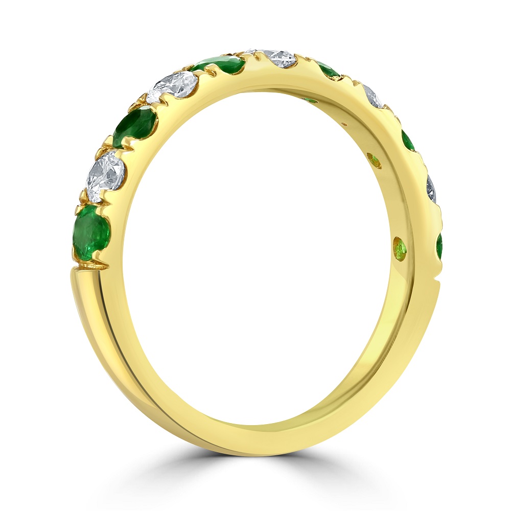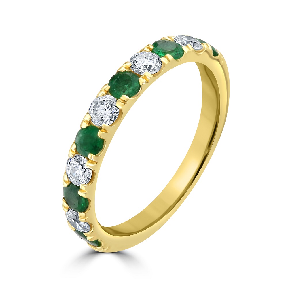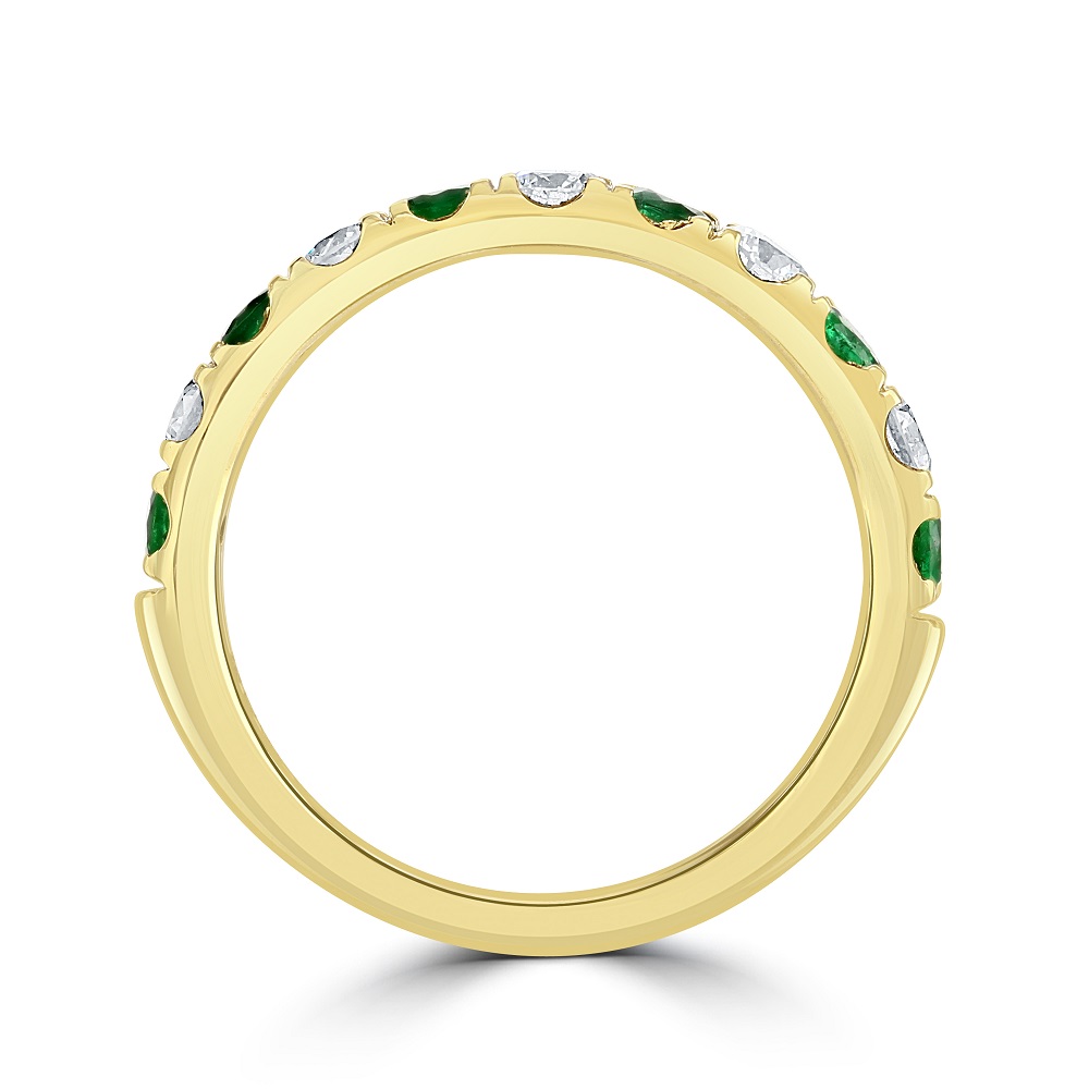 Our exquisite 18ct yellow gold half eternity ring is a symbol of everlasting elegance and refined craftsmanship. This luxurious ring features a captivating sequence of six round emeralds and five round brilliant-cut diamonds, alternating harmoniously around the band. The emeralds, totalling 0.57ct, are chosen for their vibrant green hue, embodying renewal, growth, and the natural beauty of the earth. Complementing the emeralds, the diamonds add up to a total weight of 0.49ct, selected for their brilliance and clarity, offering a dazzling contrast and sparkle.