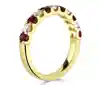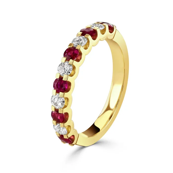 Embrace the timeless elegance of our 18ct yellow gold half eternity ring, beautifully crafted to celebrate enduring love and commitment. This exquisite ring features a sophisticated cog setting, housing six round rubies and five round brilliant-cut diamonds in perfect alternation. The rubies, totalling 0.58 carats, offer a rich, deep red hue that symbolizes passion, while the diamonds, with a total weight of 0.38 carats, provide a dazzling contrast with their clear, radiant sparkle. Designed for everyday elegance or special occasions, this ring is a perfect choice for an anniversary gift or a personal treasure, blending classic style with a touch of modern luxury.