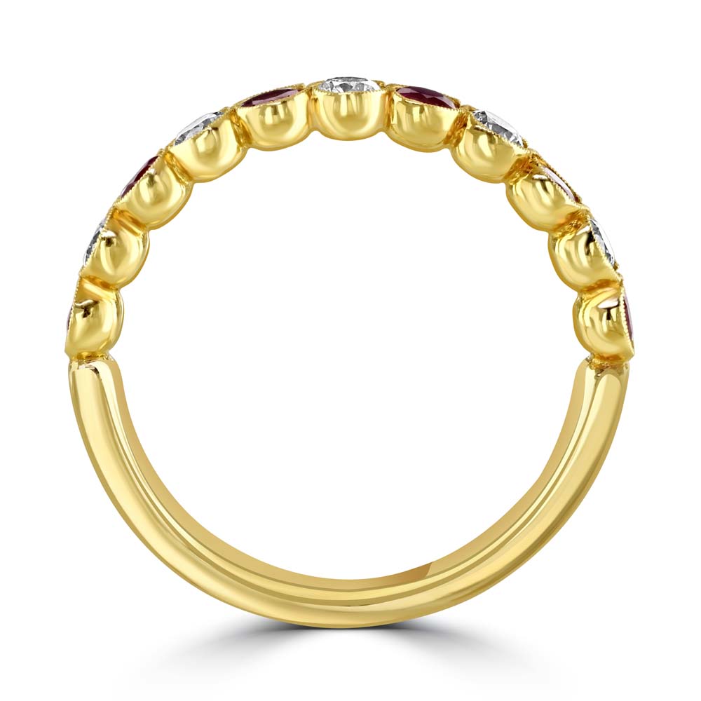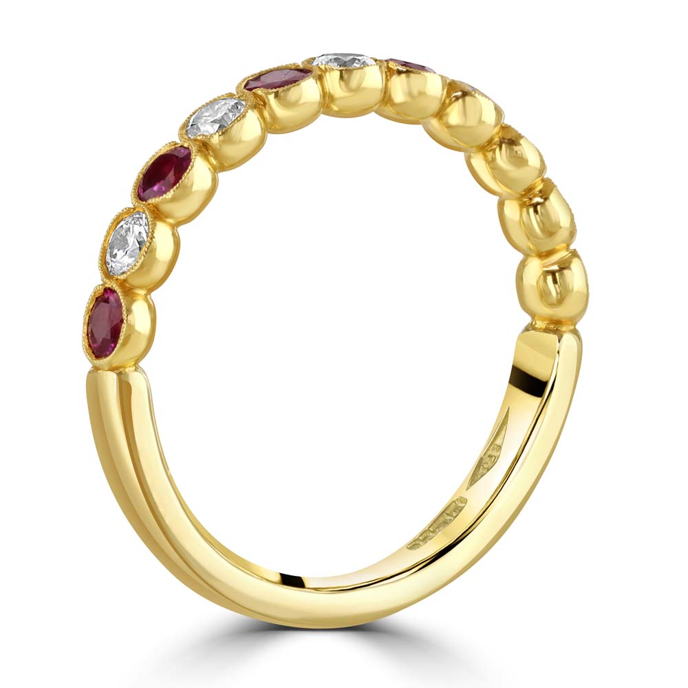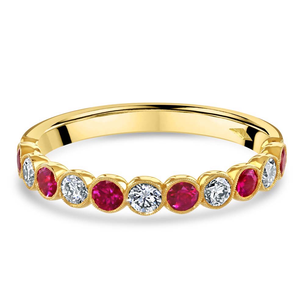 A stunning 18ct yellow gold half eternity ring, an exquisite piece of fine jewellery that combines elegance with a touch of vintage charm. This ring features an alternating sequence of six round rubies and five round brilliant-cut diamonds, all set in a secure rubover setting with delicate milgrain detailing. The rubies, with a total weight of 0.52 carats, offer a vibrant splash of colour, while the diamonds, totalling 0.36 carats, add a continuous sparkle that enhances the overall design. This ring is perfect for everyday wear or as a special gift to commemorate a meaningful occasion. Ideal for those who appreciate the beauty of gemstones paired with the sophistication of intricate details, this half eternity ring is a timeless choice that promises to captivate.