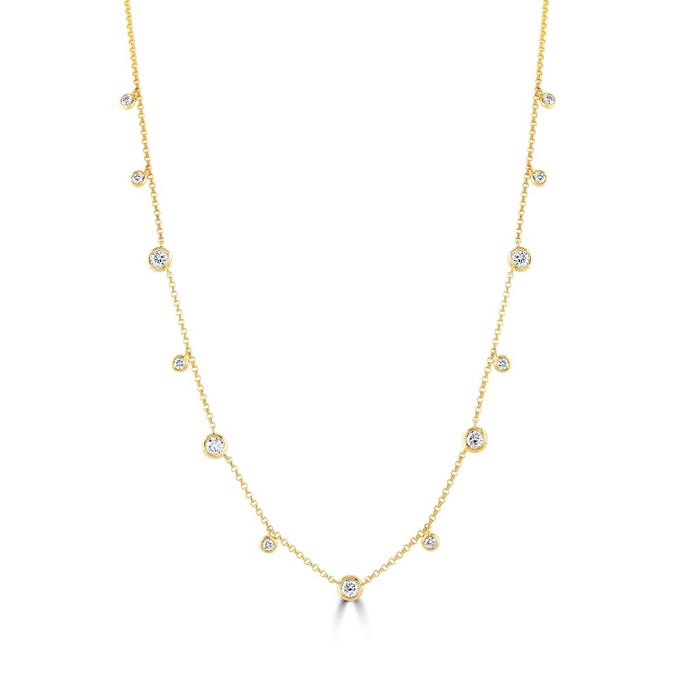 Delicate and radiant, this 18ct yellow gold necklace features a graceful arrangement of thirteen rubover-set round brilliant cut diamonds, evenly spaced along a fine trace chain. Each diamond is securely encased in a smooth rubover setting, offering a contemporary look while enhancing brilliance and wearability. The chain measures 18 inches, with an adjustable option to 16 inches, allowing for versatile styling—perfect for layering or wearing as a standalone statement of elegance. A refined blend of sparkle and simplicity, this necklace is a timeless addition to any fine jewellery collection—ideal for everyday luxury or gifting with meaning.