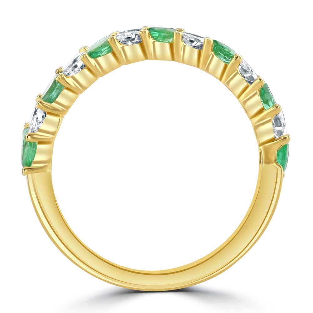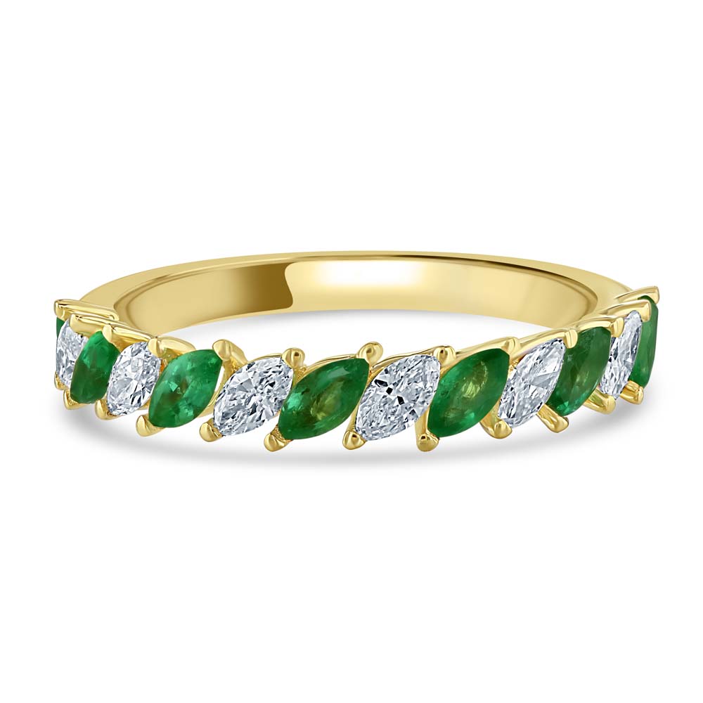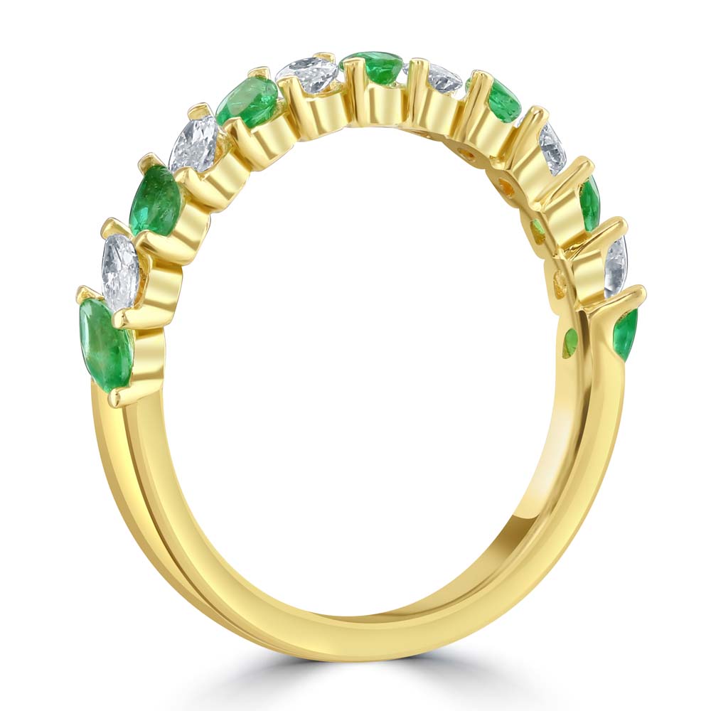 An alluring 18ct yellow gold half eternity ring, a piece that epitomizes luxury and timeless elegance. This captivating ring features an alternating pattern of seven marquise-cut emeralds and six marquise-cut diamonds, meticulously claw-set to showcase their unique shapes and brilliant hues. The emeralds, with a total weight of 0.57cts, radiate a vibrant green colour, symbolizing growth, renewal, and the rich tapestry of nature. Complementing the emeralds, the diamonds add a total weight of 0.40ct, sparkling with unparalleled clarity and brilliance, reflecting the light in a dance of splendour.