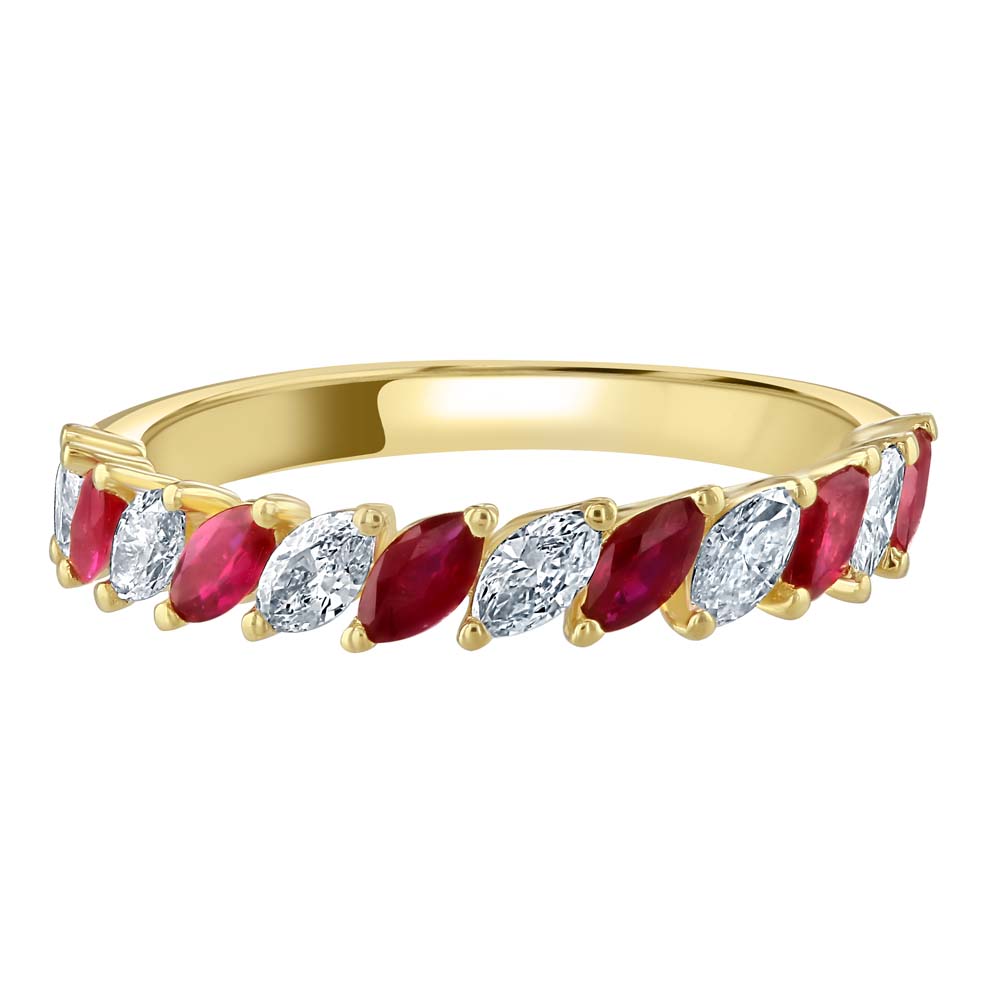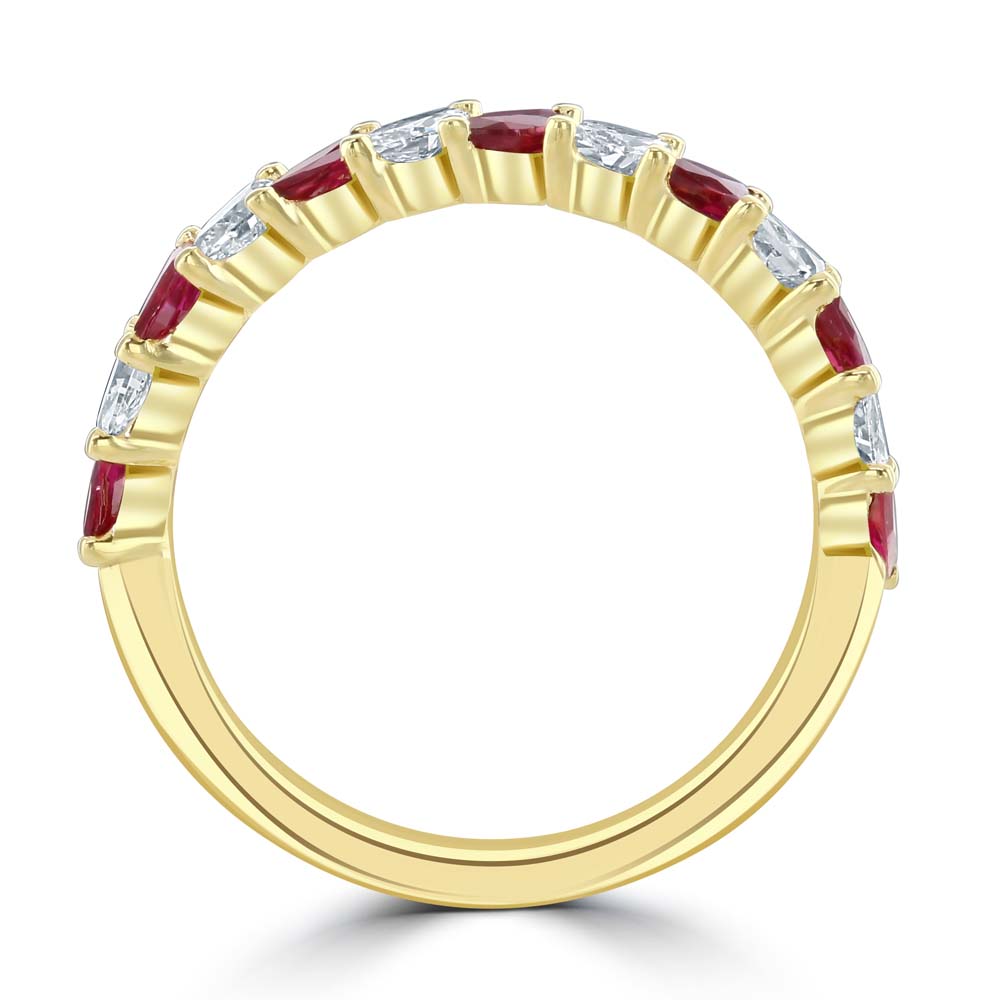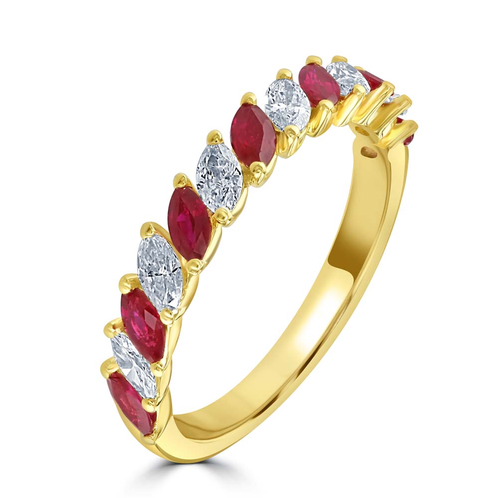 Discover the timeless elegance of our 18ct yellow gold half eternity ring, a luxurious piece that combines classic sophistication with exquisite design. This stunning ring features alternating marquise-cut rubies and diamonds, claw-set to showcase their unique shapes and brilliant hues. Seven marquise-cut rubies, totalling 0.60 carats, radiate a vibrant red, symbolizing passion and love. Complementing them are six marquise-cut diamonds, totalling 0.43 carats, which add a touch of dazzling brilliance to the piece. Crafted in lustrous 18ct yellow gold, this half eternity ring is perfect for those who appreciate elegant, timeless jewellery with a modern twist. Ideal for an anniversary gift, wedding band, or a sophisticated addition to any jewellery collection, this ring promises to be a beloved piece for years to come.