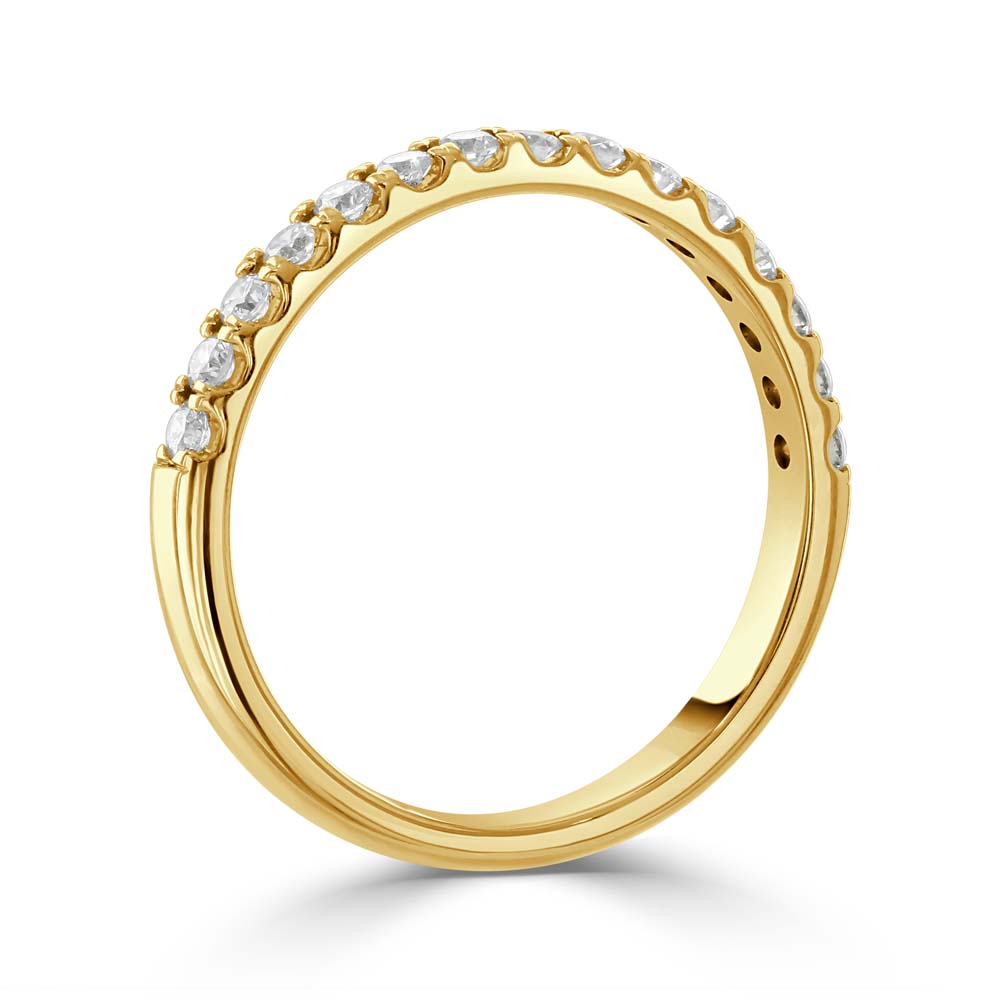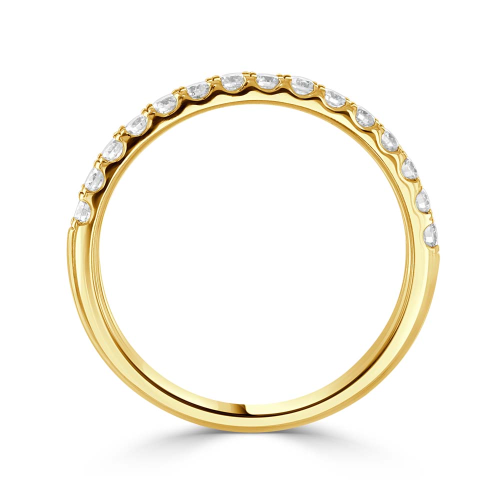 Set on a softened court band, this half eternity ring provides both comfort and style, making it an ideal choice for everyday wear or special occasions. The refined yellow gold complements the bright diamonds, offering a warm, classic look that never goes out of style.