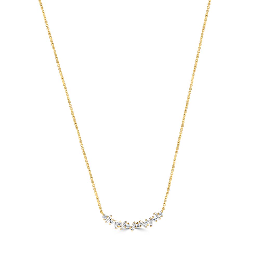 Enhance your elegance with this stunning 18ct yellow gold necklace. This exquisite piece features a captivating arrangement of alternating diamonds: eight round brilliant-cut diamonds and seven baguette-cut diamonds. The round diamonds have a total weight of 0.20ct, while the baguette diamonds total 0.22ct, creating a harmonious blend of shapes and sparkle. The necklace is crafted with an integrated 17-inch trace chain, which is adjustable to 16 inches and 15 inches, offering versatile styling options to suit any neckline. The warm, rich hue of the yellow gold beautifully complements the radiant diamonds, making this necklace a perfect accessory for both everyday wear and special occasions. Whether you're dressing up for a formal event or adding a touch of luxury to your daily attire, this necklace is the ideal piece to enhance any outfit. Experience the perfect blend of modern design and timeless elegance with this 18ct yellow gold necklace. It is not just a piece of jewellery, but a statement of refined taste and style.
