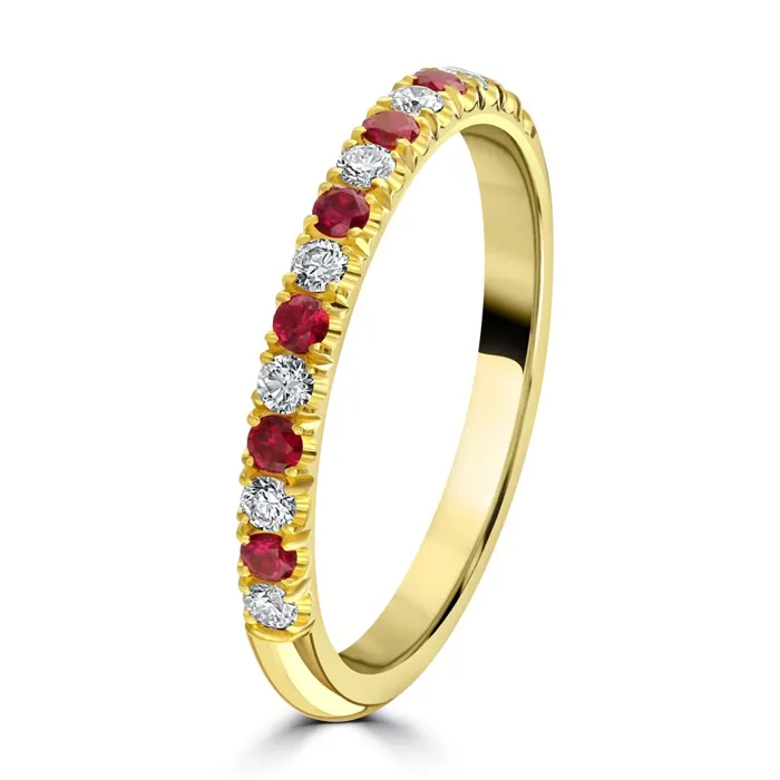 Discover the exquisite beauty of our 18ct yellow gold half eternity ring, featuring a captivating design of alternating gemstones. This luxurious ring showcases seven round rubies and eight round brilliant cut diamonds, each securely claw set to maximize their brilliance and sparkle. With a total ruby weight of 0.14 carats and a total diamond weight of 0.14 carats, this ring offers a harmonious blend of vibrant colour and dazzling light. Perfect for celebrating special occasions or adding a touch of sophistication to your jewellery collection, this 18ct yellow gold half eternity ring combines timeless elegance with exceptional craftsmanship. The rich yellow gold band beautifully complements the vivid red rubies and the radiant diamonds, creating a piece that symbolizes enduring love and elegance.