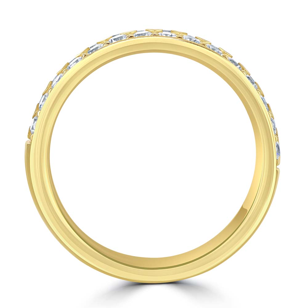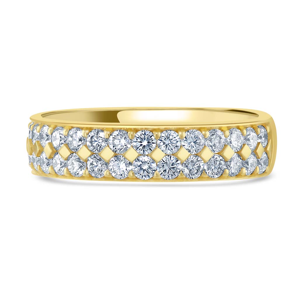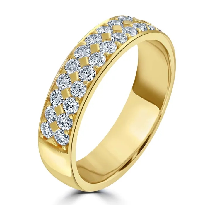 Enhance your jewellery collection with our exquisite 18ct yellow gold ring, featuring two rows of meticulously pavé-set round brilliant cut diamonds. This stunning piece boasts a total diamond weight of 0.85 carats, offering a continuous sparkle that wraps around the band for a luxurious and eye-catching effect. Crafted from high-quality 18ct yellow gold, this ring exudes warmth and elegance, making it a perfect choice for those seeking a touch of glamour. Ideal for special events or as a sophisticated addition to your daily ensemble, this pavé diamond ring combines timeless design with contemporary appeal, ensuring it remains a favourite for years to come.