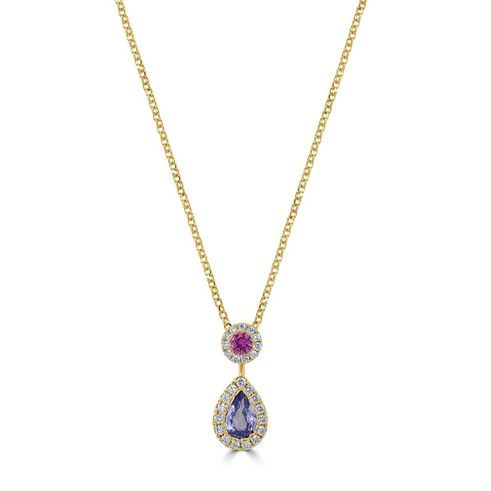 Discover the striking beauty of our 18ct yellow gold drop pendant that combines the allure of sapphires with the sparkle of diamonds. This exquisite pendant features two distinct and vibrant sapphires: a round pink sapphire weighing 0.09ct, and a pear-cut blue sapphire weighing 0.40ct. Each sapphire is encircled by a halo of round brilliant cut diamonds, adding an extra layer of brilliance and elegance. The pink sapphire is delicately surrounded by diamonds that highlight its stunning hue, while the larger blue sapphire beneath it is also framed by diamonds, creating a mesmerizing effect. Together, these gemstones form a pendant that is both colourful and sophisticated. Suspended from an 18-inch trace chain crafted in the same luxurious 18ct yellow gold, the chain is adjustable to 17 inches, allowing for versatility in wear. This feature ensures the pendant sits perfectly at the neckline, making it ideal for various outfits and occasions. With a total of 26 diamonds weighing 0.14ct, this pendant sparkles with every movement, reflecting light beautifully. It's a perfect choice for those who appreciate exquisite jewellery that combines classic elements with a touch of modern design, making it a stunning addition to any collection or a memorable gift for a special someone.