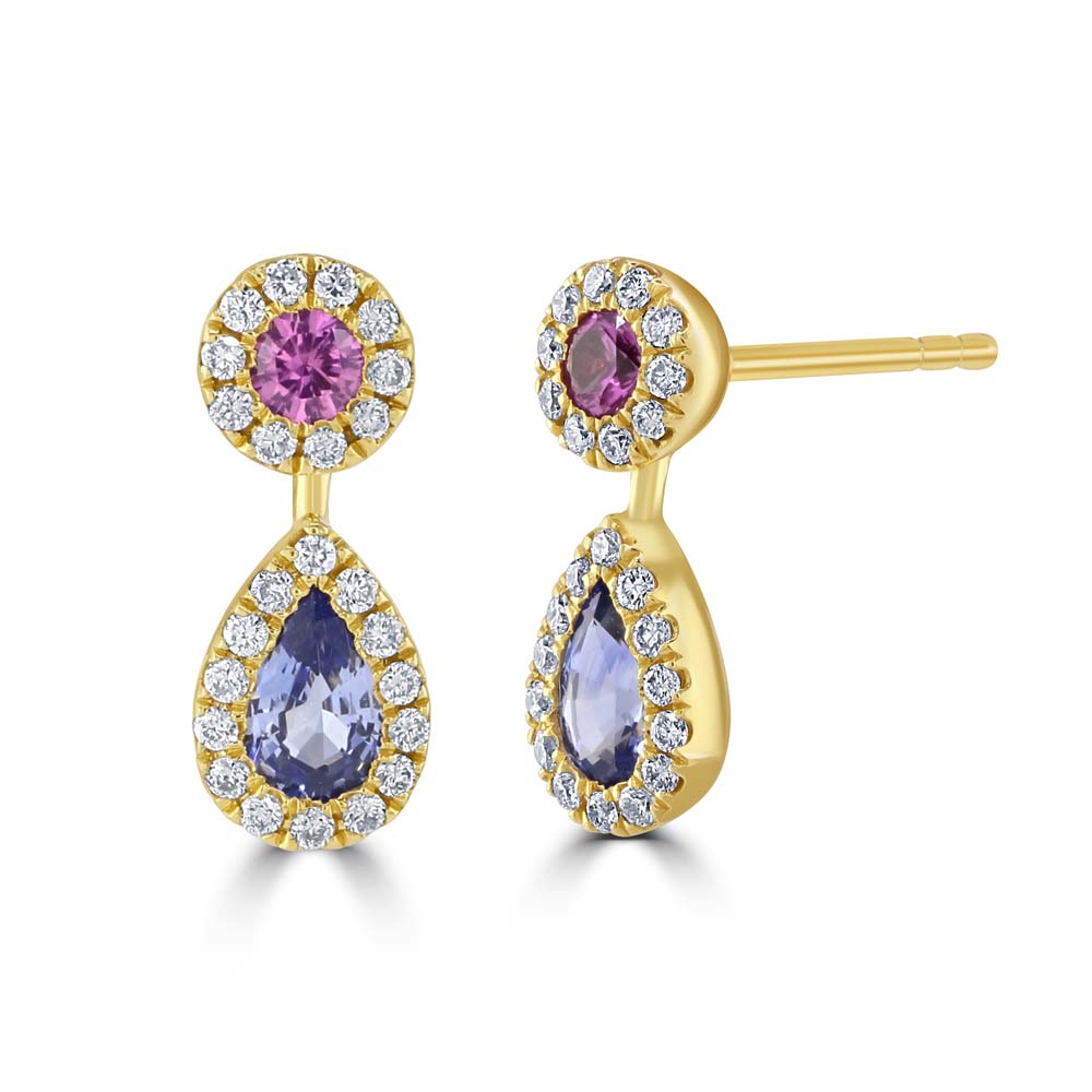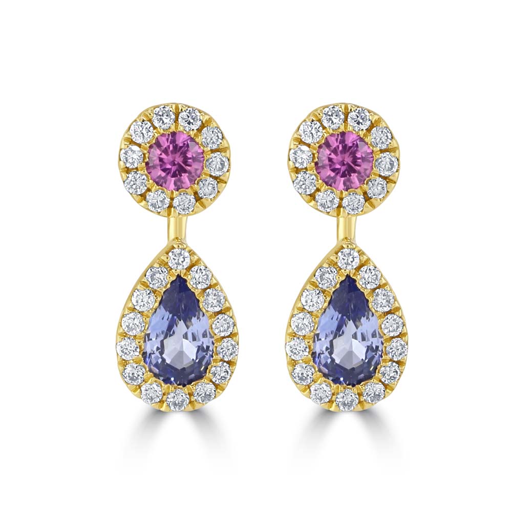 Discover the exquisite charm of our 18ct yellow gold drop stud earrings, featuring a stunning combination of pink and blue sapphires. Each earring showcases a round pink sapphire, surrounded by a halo of round brilliant-cut diamonds. Beneath it, a pear-cut blue sapphire is also surrounded by a shimmering halo of round brilliant-cut diamonds. With a total weight of 0.16ct for the pink sapphires, 0.43ct for the blue sapphires, and 0.19ct for the 48 diamonds, these earrings offer a dazzling display of colour and brilliance. Secured with post and butterfly fittings, they ensure comfort and a secure fit for pierced ears. Elevate your jewellery collection with these luxurious yellow gold sapphire and diamond drop stud earrings, perfect for adding a touch of elegance to any occasion.