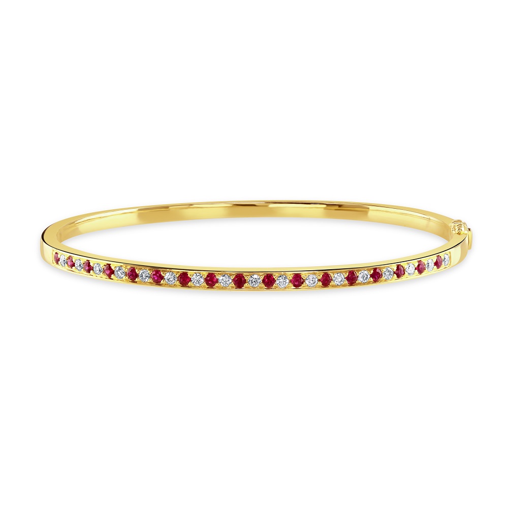 A luxurious 18ct yellow gold oval hinged bangle, a true masterpiece of fine jewellery design. This exquisite bangle is meticulously grain set with 17 vibrant round rubies and 17 dazzling round brilliant-cut diamonds, alternating in a harmonious sequence that captures the light with every movement. The rubies, totalling 0.51 carats, exude a rich, captivating red, while the diamonds, weighing a total of 0.34 carats, sparkle with clarity and brilliance. Crafted with a secure hinged closure for easy wear, this bangle is perfect for elevating evening wear or adding a touch of opulence to your everyday attire. Embrace elegance with this stunning piece, which combines classic style with modern luxury.