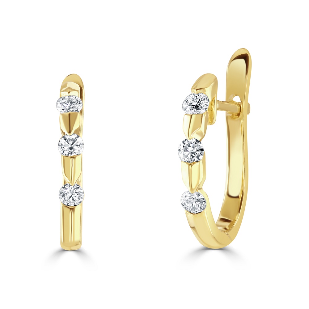 A beautiful pair of 18ct yellow gold hinged hoop earrings, each adorned with three round brilliant cut diamonds, set to perfection. These exquisite earrings boast a total diamond weight of 0.18 carats, offering just the right amount of sparkle to catch the eye without overwhelming. Crafted from premium 18ct yellow gold, these hoop earrings feature a sleek and modern design that hinges open for easy wear, ensuring both security and comfort. The bar setting not only secures the diamonds safely but also allows for maximum exposure of each gem, enhancing their brilliance and sparkle with every turn of the head. Ideal for both day-to-day elegance and special occasions, these earrings seamlessly blend classic charm with contemporary style. Their understated design makes them a versatile addition to any jewellery collection, suitable for enhancing both casual and formal ensembles.