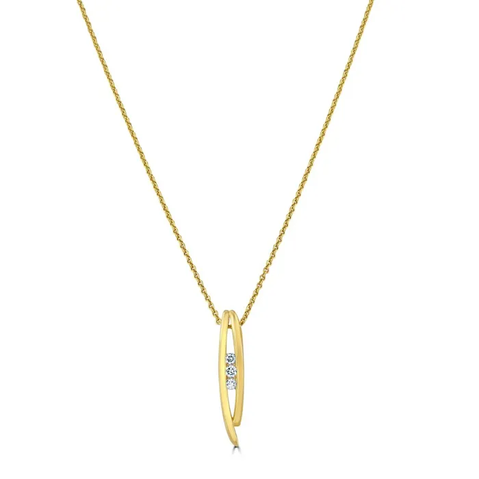 Our stunning 18ct yellow gold pendant is a masterpiece of design that blends timeless elegance with modern sophistication. This exquisite piece features two delicately curved vertical lines of varying lengths, each adorned with three sparkling round brilliant cut diamonds set gracefully in between. The pendant is elegantly suspended from an 18-inch adjustable 18ct yellow gold trace chain, which can be shortened to 17 inches for a perfect fit.