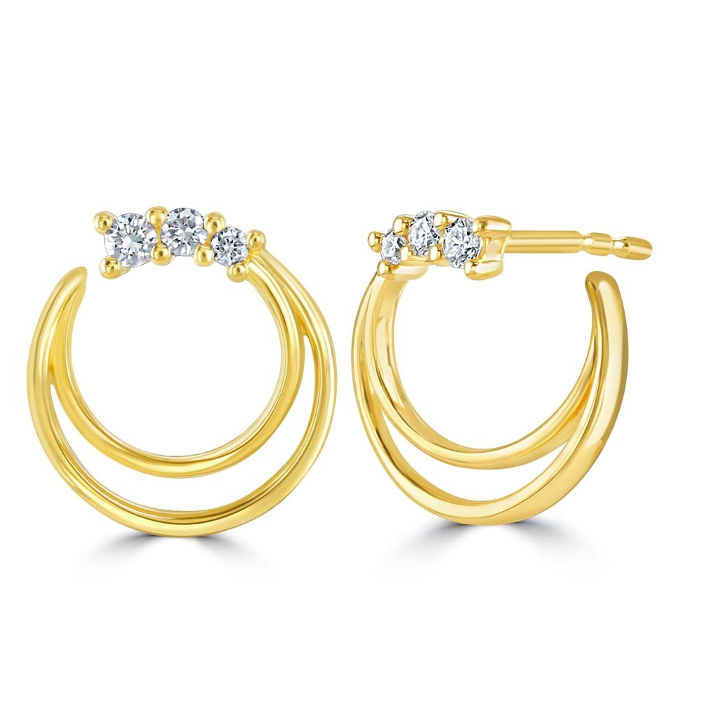 Add a touch of sophistication to your jewellery collection with these stunning 18ct yellow gold stud earrings. Featuring a unique double-stranded twisted crescent shape, each earring is adorned with three graduated round brilliant-cut diamonds, claw set at the top. The total diamond weight for both earrings is 0.12ct, offering a delicate yet captivating sparkle. The warm, rich hue of the yellow gold beautifully complements the radiant diamonds, creating a timeless and elegant look. The post and butterfly fittings ensure a secure and comfortable fit, making these earrings perfect for both everyday wear and special occasions. Whether you're dressing up for a formal event or adding a touch of luxury to your daily attire, these earrings are the perfect accessory to enhance any outfit.