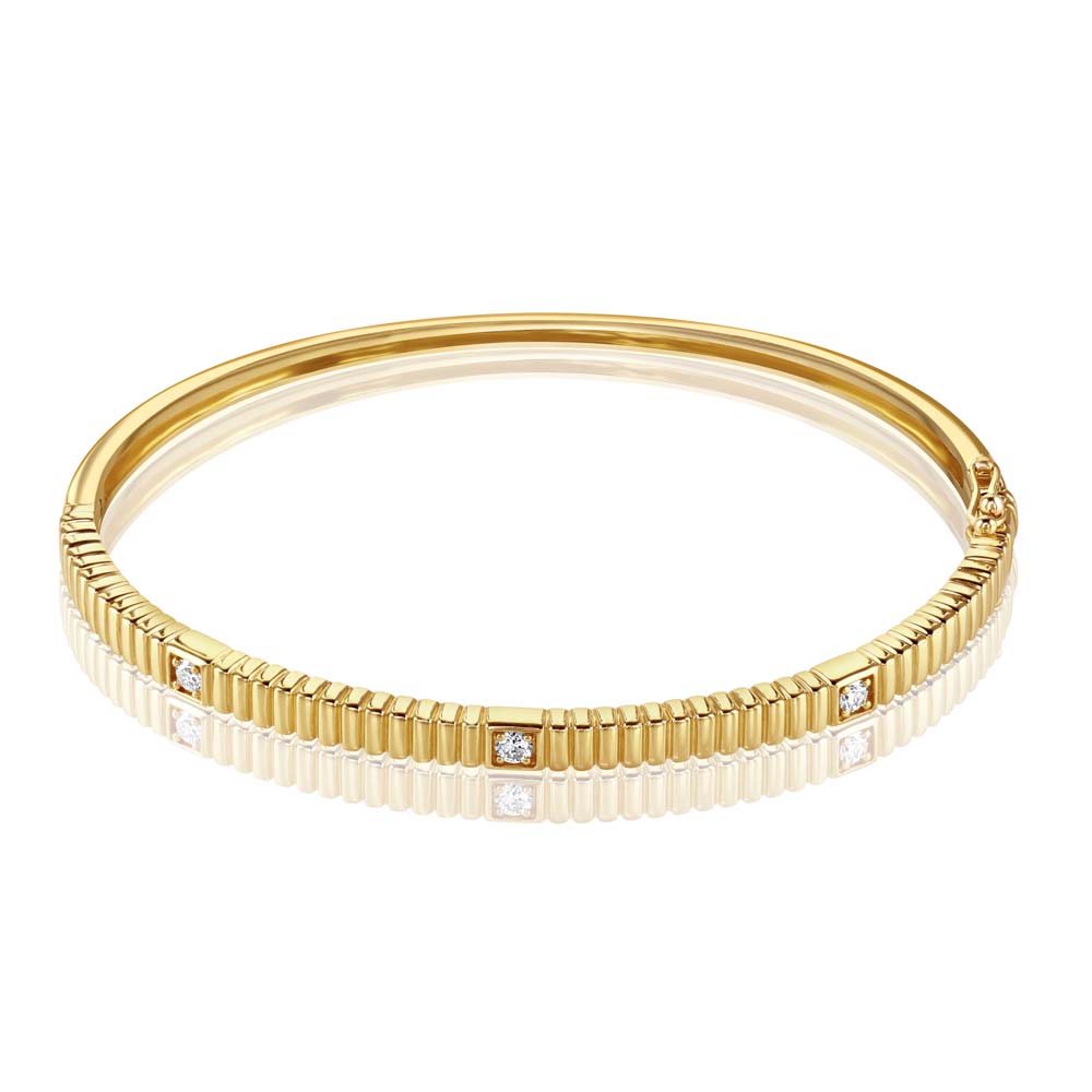 Our elegant 18ct yellow gold bangle, a stunning piece that combines classic design with refined luxury. This exquisite bangle features a ridge design with three evenly spaced claw set round brilliant cut diamonds, totalling approximately 0.15 carats. Each diamond is meticulously set to showcase its dazzling brilliance, complemented by the warm tones of the 18ct yellow gold. The bangle is secured with a robust double figure 8 safety clasp, ensuring both safety and comfort for everyday wear. Its sleek and polished design makes it an ideal accessory for any occasion, adding a touch of sophistication and sparkle to your wardrobe. Perfect for those who appreciate understated elegance, this yellow gold bangle with its precise diamond setting offers a timeless look that will never go out of style. Whether it's a gift for a special someone or a treat for yourself, this bangle is sure to impress and be cherished.
