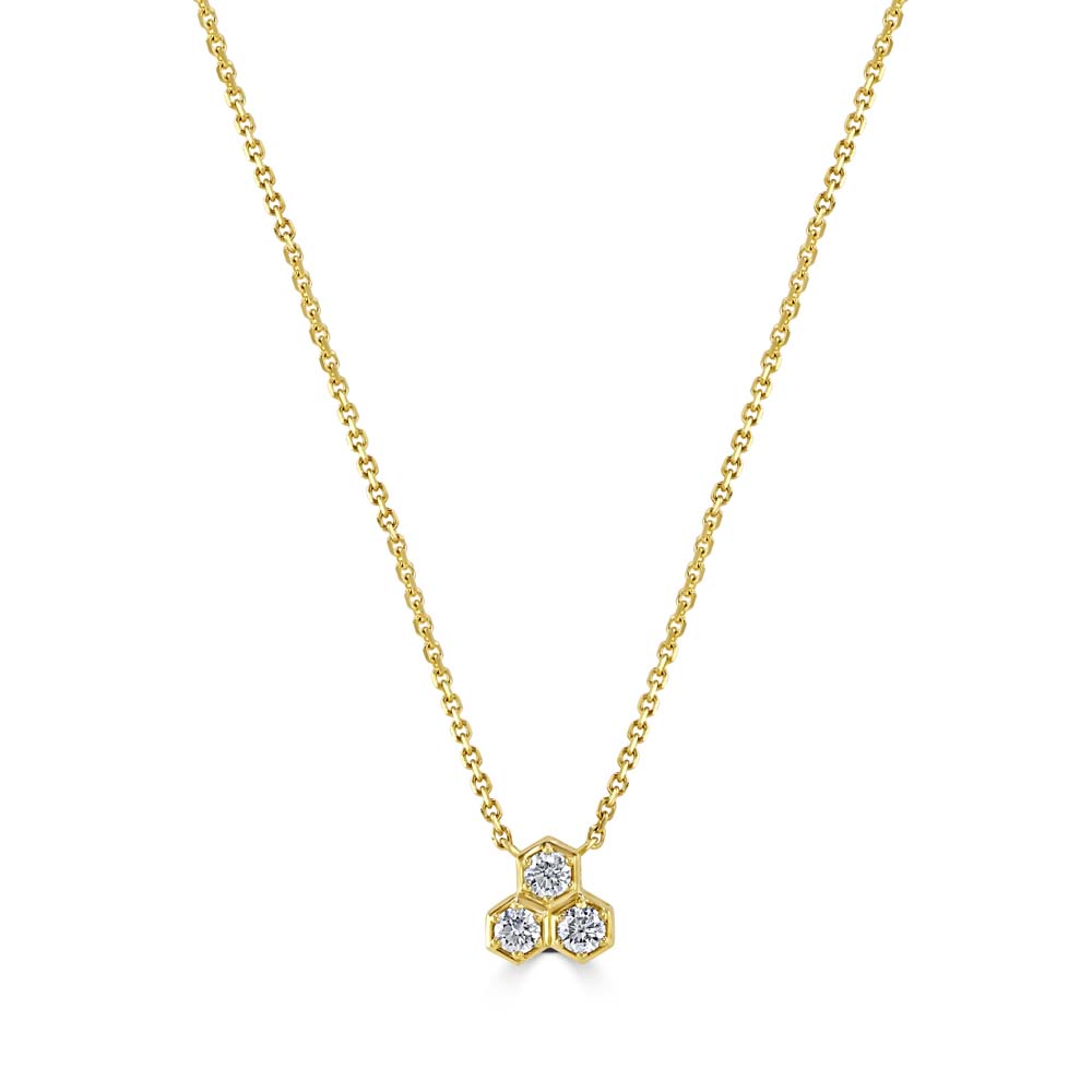 Discover the timeless beauty of our 18ct yellow gold pendant, featuring three elegant hexagon shapes, each adorned with a single round brilliant cut diamond. The diamonds are securely set in classic six-claw settings, offering a sophisticated touch of sparkle. This exquisite pendant is seamlessly integrated with a 16-inch trace chain, also crafted from luxurious 18ct yellow gold, ensuring a harmonious and refined design. With a total diamond weight of 0.25 carats, the round brilliant cut diamonds are meticulously selected for their exceptional brilliance, enhancing the pendant’s overall radiance. The unique hexagon shapes provide a modern geometric twist, making this piece both stylish and versatile, perfect for elevating any outfit.