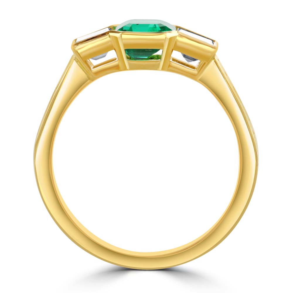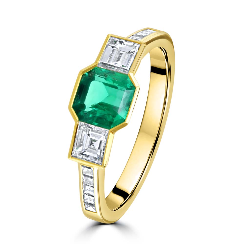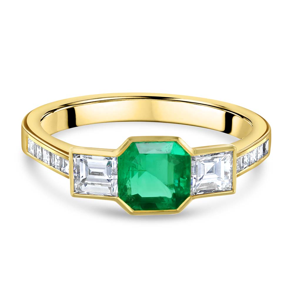 An exquisite 18ct yellow gold trilogy ring, featuring a captivating octagonal cut emerald at its centre, securely held in a rubover setting. Flanking the vibrant emerald are two princess cut diamonds, also rubover set, adding a touch of brilliance and elegance. Each shoulder of the ring is adorned with five channel set princess cut diamonds, enhancing the overall sparkle and sophistication. The rich green emerald symbolizes renewal and growth, while the princess cut diamonds provide a timeless sparkle. This unique trilogy design represents the past, present, and future, making it an ideal choice for celebrating significant milestones or as a cherished gift for a loved one.