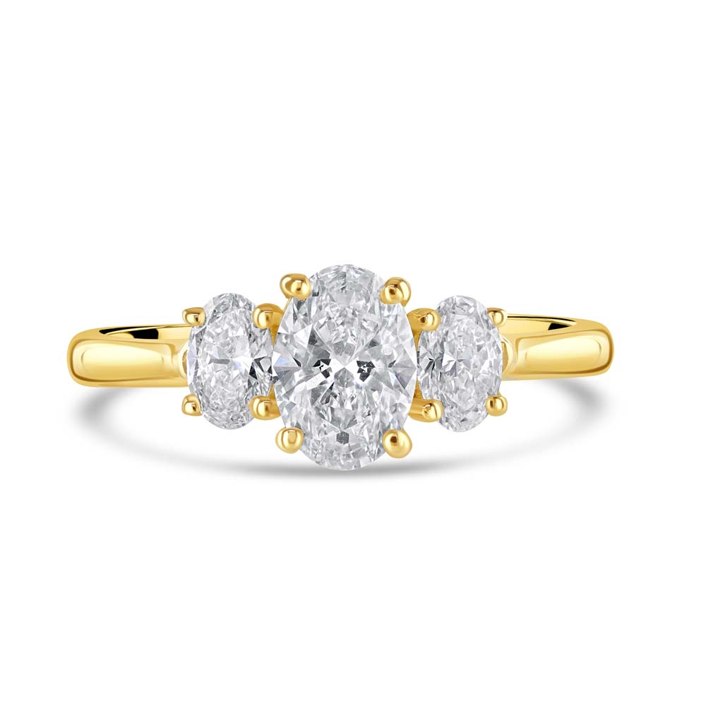 A graceful celebration of love and light, this trilogy ring is beautifully crafted in warm 18ct yellow gold and showcases three oval cut diamonds in classic four-claw settings. At its centre, a dazzling 0.60ct diamond of exceptional quality—graded E for colour and VS2 for clarity—radiates brilliance and purity. Flanking the centre stone are two perfectly matched oval diamonds with a combined weight of 0.36ct, completing the timeless trilogy design that symbolises your past, present, and future. The elongated shape of the oval cut enhances the ring’s elegance, offering a flattering silhouette with captivating sparkle. A refined and romantic choice, this ring is ideal for marking life’s most meaningful moments with sophistication and style.