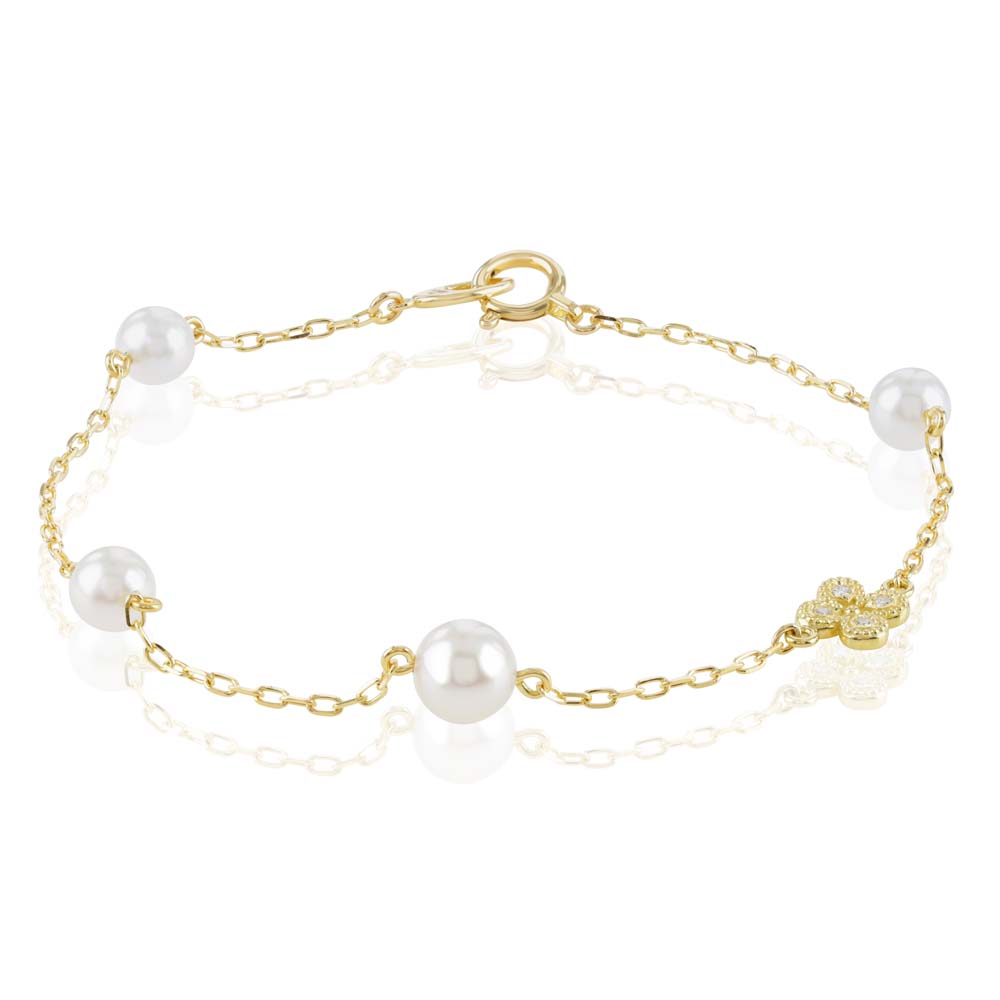 A pretty 18ct yellow gold chain bracelet by Mikimoto, the foremost producer of the finest quality cultured pearls. Four evenly spaced Akoya cultured pearls are set off beautifully with an 18ct yellow gold flower set with sparkling round brilliant cut diamonds. Other variations are available, please contact the store for more details.