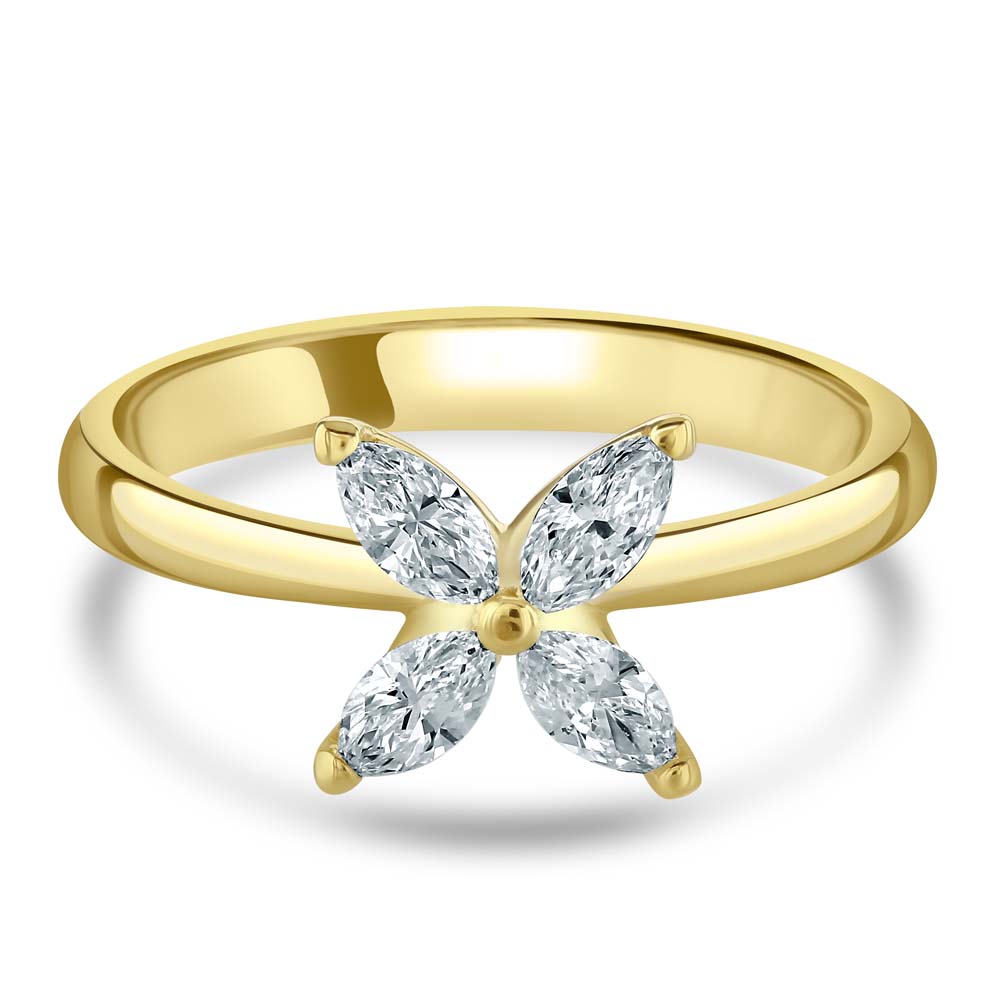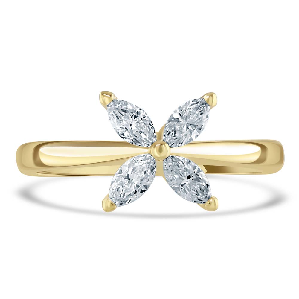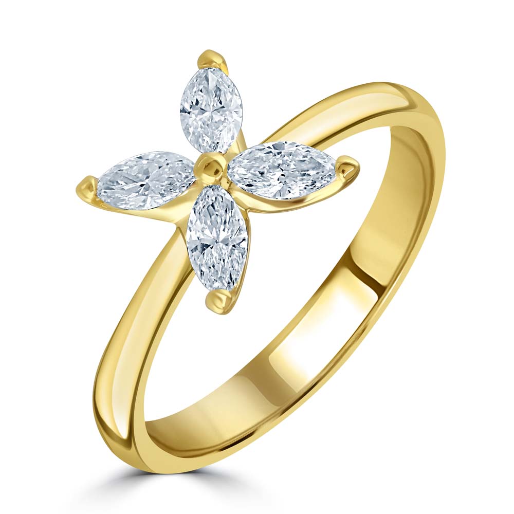 Add a touch of nature-inspired elegance to your jewellery collection with our 18ct yellow gold flower ring, beautifully crafted to emulate the delicate form of a blooming flower. This exquisite ring features four marquise cut diamonds, each meticulously claw-set to represent the petals. Together, these diamonds weigh a total of 0.47 carats, showcasing a dazzling display of brilliance and clarity that enhances the overall aesthetic of the ring. The warm hue of the 18ct yellow gold complements the sparkle of the diamonds, creating a stunning piece that's perfect for any occasion, from casual outings to more formal events. Ideal for those who cherish unique, floral designs and the timeless allure of diamonds, this ring is a captivating choice that promises to enchant.