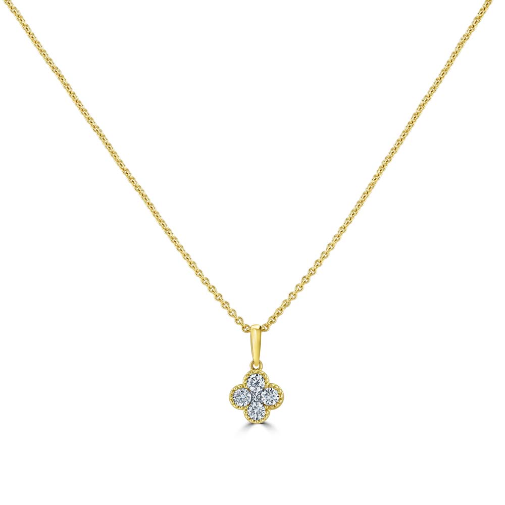 This pendant is exquisitely crafted from 18ct yellow gold, presents a charming quatrefoil design, combining classic motifs with modern elegance. It features four round brilliant cut diamonds, each meticulously set to form the petals of the quatrefoil, radiating brilliance and creating a captivating display of light. At the centre of this floral-inspired design is a princess cut diamond, known for its sharp angles and exceptional sparkle, which serves as the focal point. The edges of the pendant are delicately finished with milgrain detailing, adding a touch of vintage charm, and enhancing the overall visual appeal. This exquisite piece is suspended from an 18ct yellow gold 18 inch trace chain, thoughtfully designed with an adjustable feature to shorten it to 16 inches, allowing for versatile styling options.