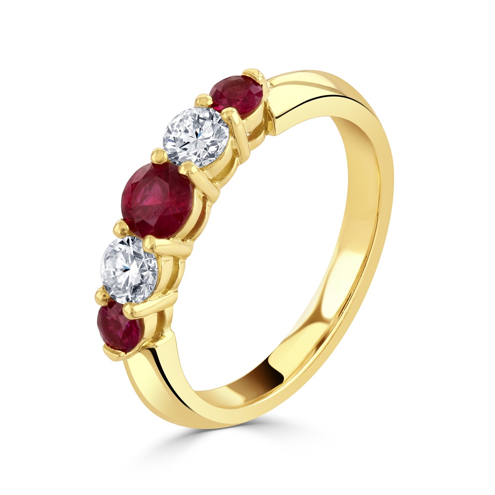 An exquisite 18ct yellow gold five gemstone ring, featuring a captivating arrangement of alternating and graduated gemstones. This ring showcases three claw-set, round rubies, totalling 0.38 carats, each radiating a deep, enchanting red. Between these stunning rubies lie two round brilliant-cut diamonds, with a combined weight of 0.40 carats, that glitter with unmatched brilliance. The claw settings enhance the visibility of each gemstone, allowing light to illuminate their breathtaking beauty from every angle. Ideal for special occasions or as a cherished gift, this ring epitomizes luxurious sophistication and adds a touch of glamour to any ensemble