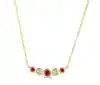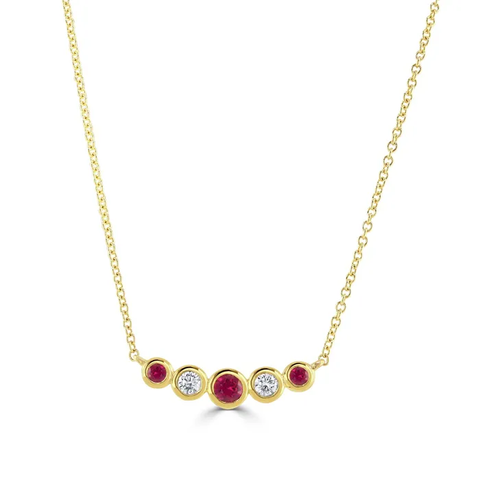 Adorn your neckline with the timeless elegance of our 18ct yellow gold garland pendant, featuring a meticulously arranged series of graduated and rubover-set gemstones. This exquisite piece includes three round rubies, with the centre ruby weighing 0.15 carats and the other two rubies totalling 0.08 carats. Complementing the vibrant rubies are two round brilliant cut diamonds, collectively weighing 0.12 carats. Each gemstone is alternately set to create a harmonious and appealing design, suspended from a delicate 18ct yellow gold trace chain. Ideal for adding a touch of sophistication to both day and evening wear, this pendant captures the essence of classic jewellery design with a modern touch.