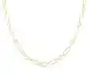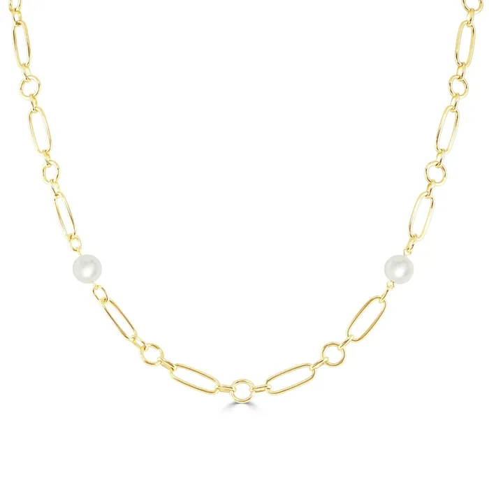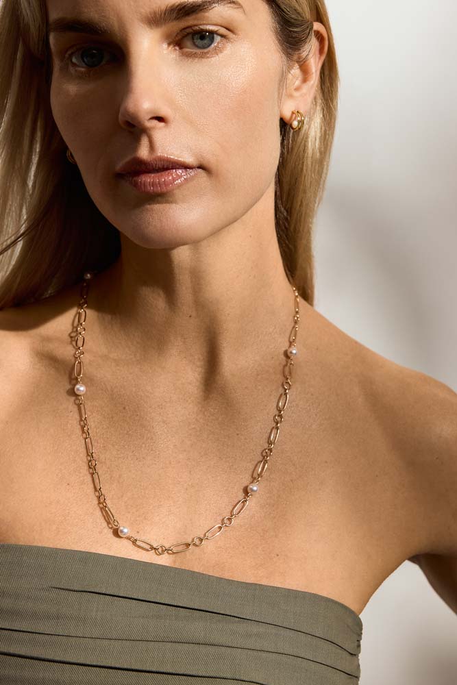A luxurious 18ct yellow gold necklet from Mikimoto's M Code Collection. This elegant necklace showcases six evenly spaced Akoya cultured pearls, each with a diameter of 6.5mm to 6.75mm, known for their radiant lustre and perfect round shape. These pearls are beautifully integrated into the design with alternating large oval links and smaller round links, creating a harmonious balance between classic beauty and contemporary style. The 24-inch chain length offers versatility and grace, draping elegantly across the neckline to enhance any ensemble. Part of the esteemed M Code collection by Mikimoto, this necklace is a symbol of sophistication and timeless appeal.