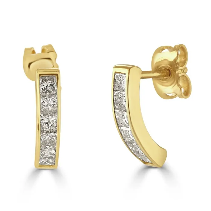 Enhance your jewellery collection with our elegant 18ct yellow gold half hoop stud earrings, featuring a sophisticated design perfect for any occasion. Each earring is adorned with six princess cut diamonds, channel set to emphasize their clarity and exceptional cut, totalling a diamond weight of 1.14 carats. The rich yellow gold setting offers a timeless appeal, while the secure post and butterfly backing provide a comfortable fit for all-day wear. These earrings combine classic style with contemporary luxury, making them an ideal choice for those seeking to add a touch of sophistication and sparkle to their ensemble.