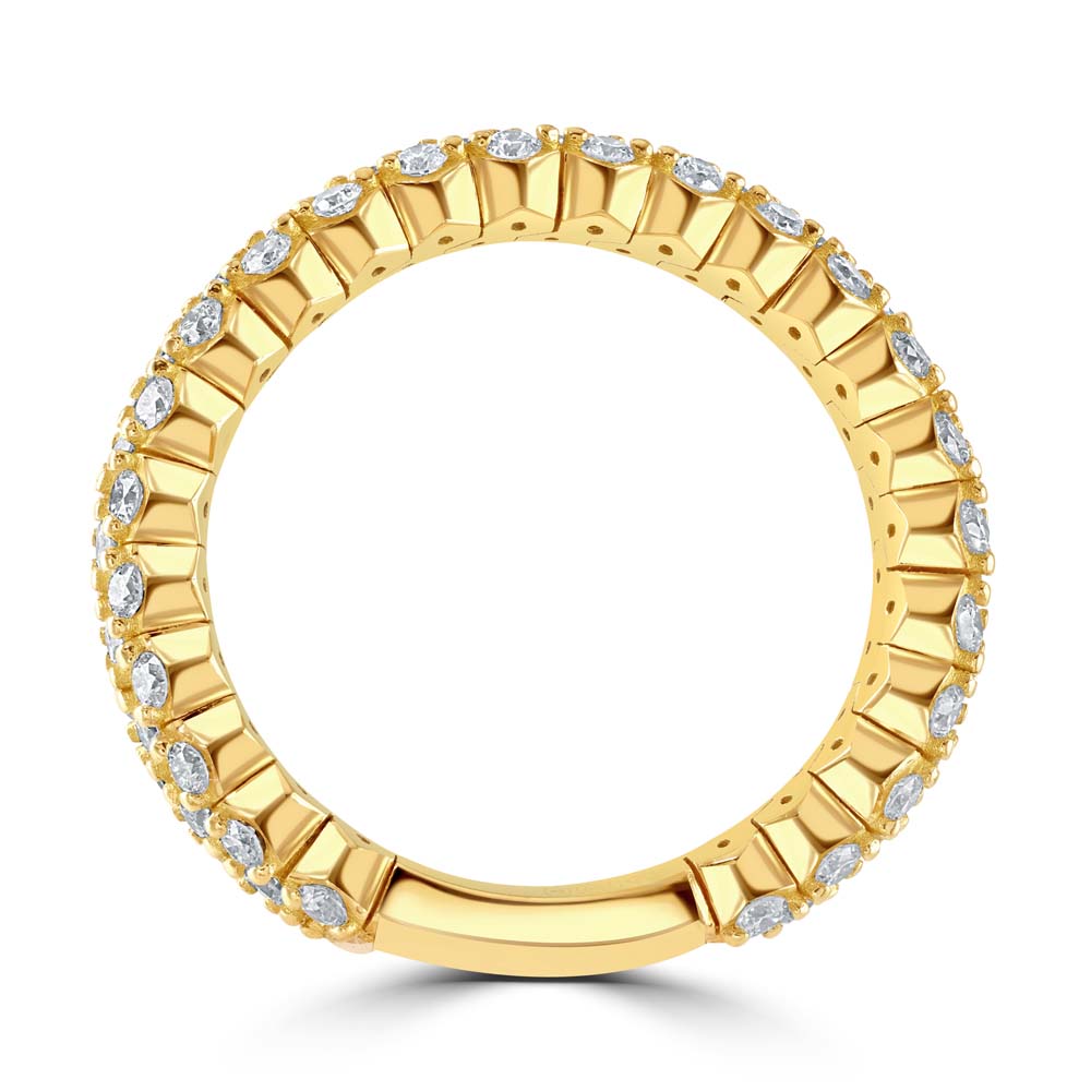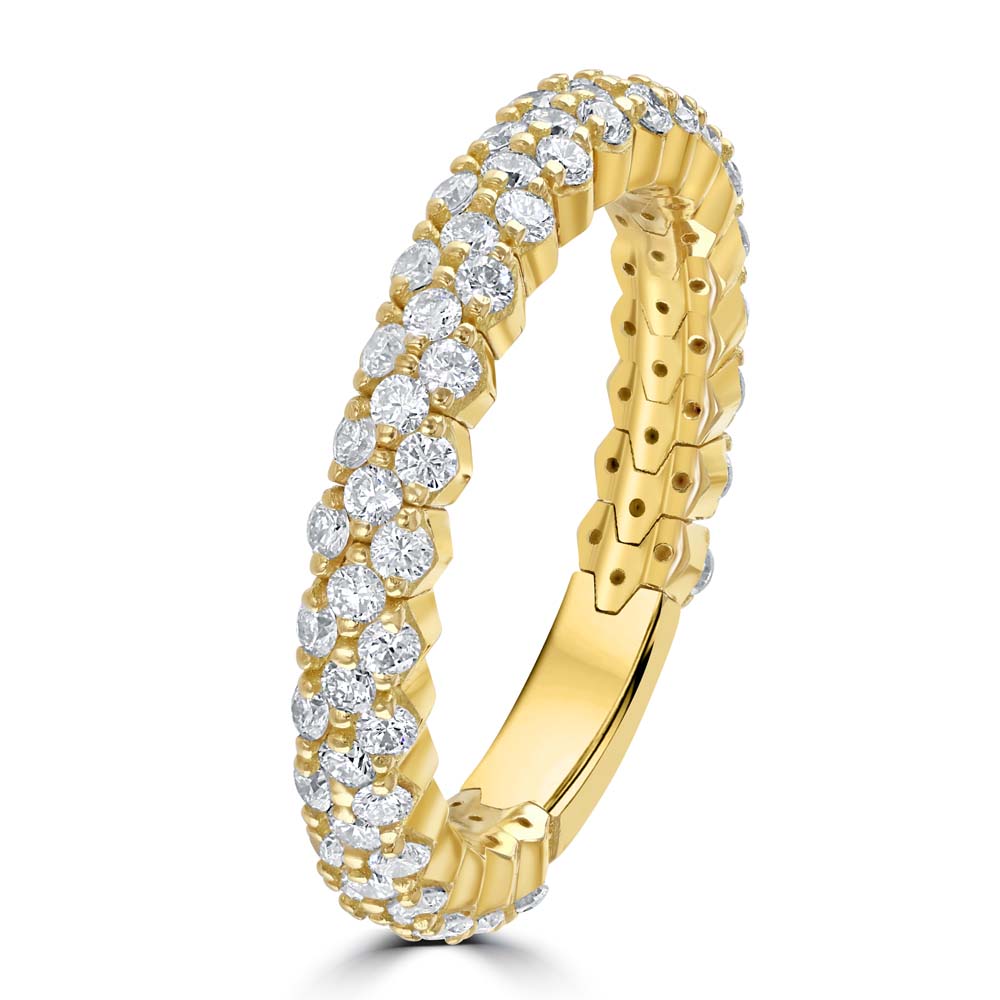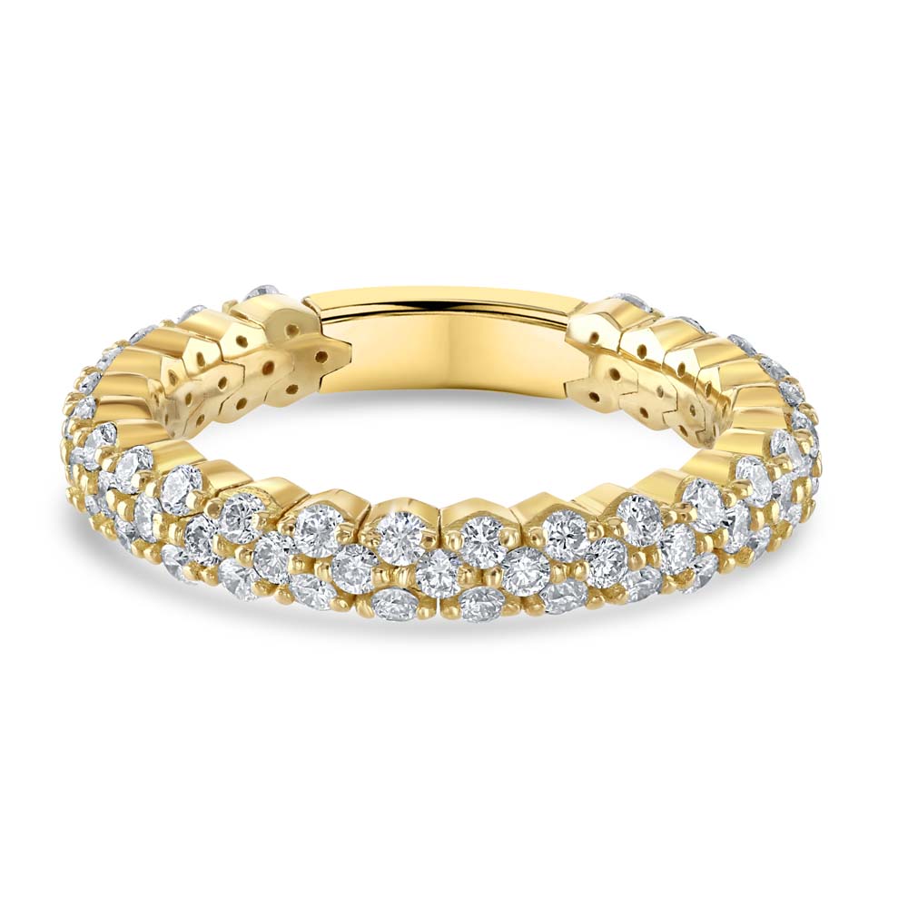 A radiant celebration of enduring elegance, this 18ct yellow gold eternity ring features seventy-two round brilliant-cut diamonds, meticulously claw set across three rows in a dazzling pavé arrangement. The alternating scale of the diamonds creates a rich texture and captivating brilliance, while the slightly flexible design ensures a comfortable and secure fit. With a total diamond weight of 1.01 carats, graded G colour, SI clarity, this ring offers exceptional sparkle and warmth. Perfect as a statement piece or a luxurious symbol of everlasting love, it combines timeless beauty with modern craftsmanship.