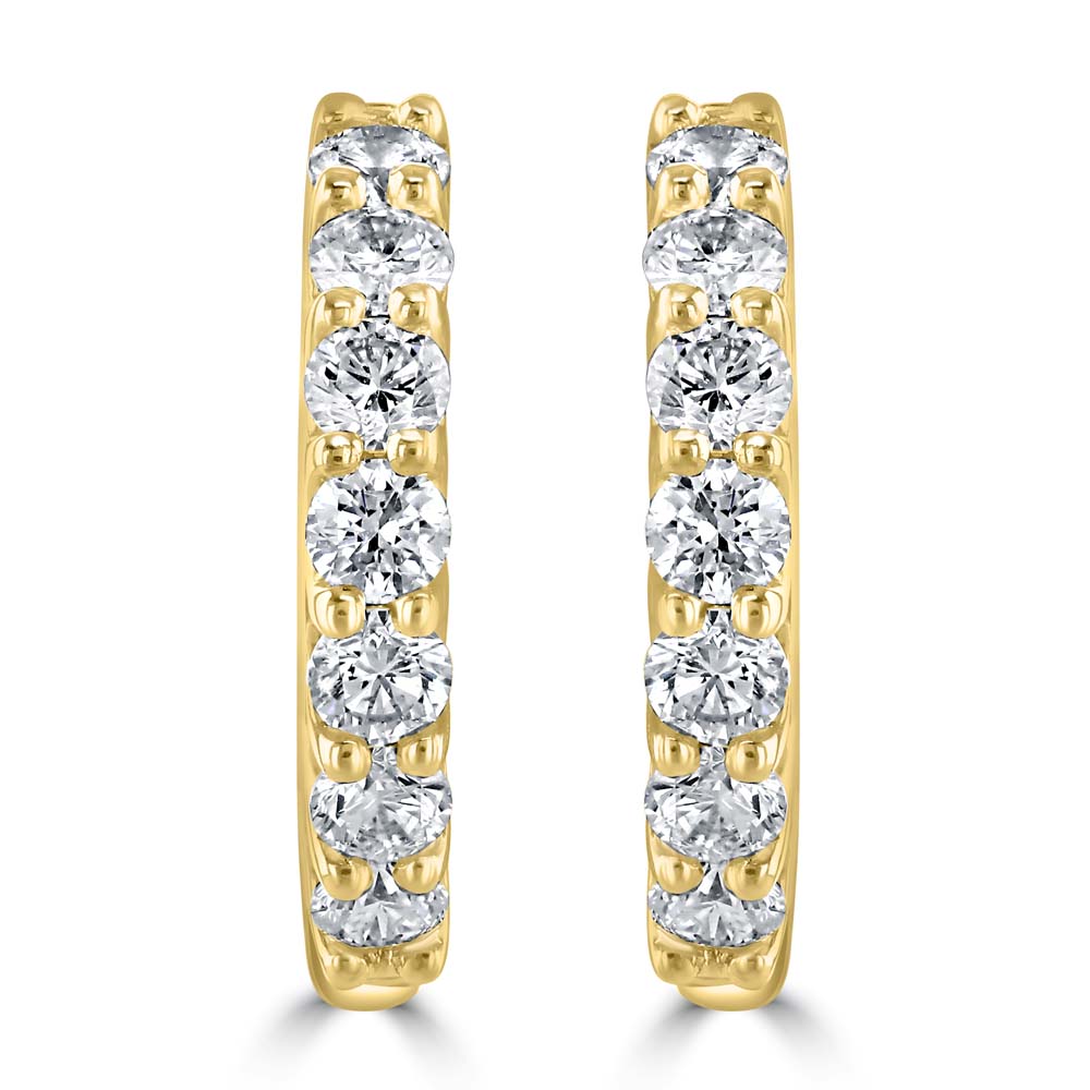 A sparkling pair of 18ct yellow gold hinged hoop earrings, each beautifully adorned with seven round brilliant cut diamonds in a secure claw setting. These elegant earrings feature a total diamond weight of 0.65 carats, designed to capture and reflect light with every movement, creating a stunning display of luminosity and style. Crafted with precision, the hinged design ensures ease of wear and security, making them perfect for both everyday elegance and special occasions. The claw setting not only enhances the visibility of each diamond but also maximizes their brilliance by allowing more light to enter. These luxurious yellow gold hoop earrings are a must-have addition to any jewellery lover's collection, offering timeless beauty and a touch of glamour.