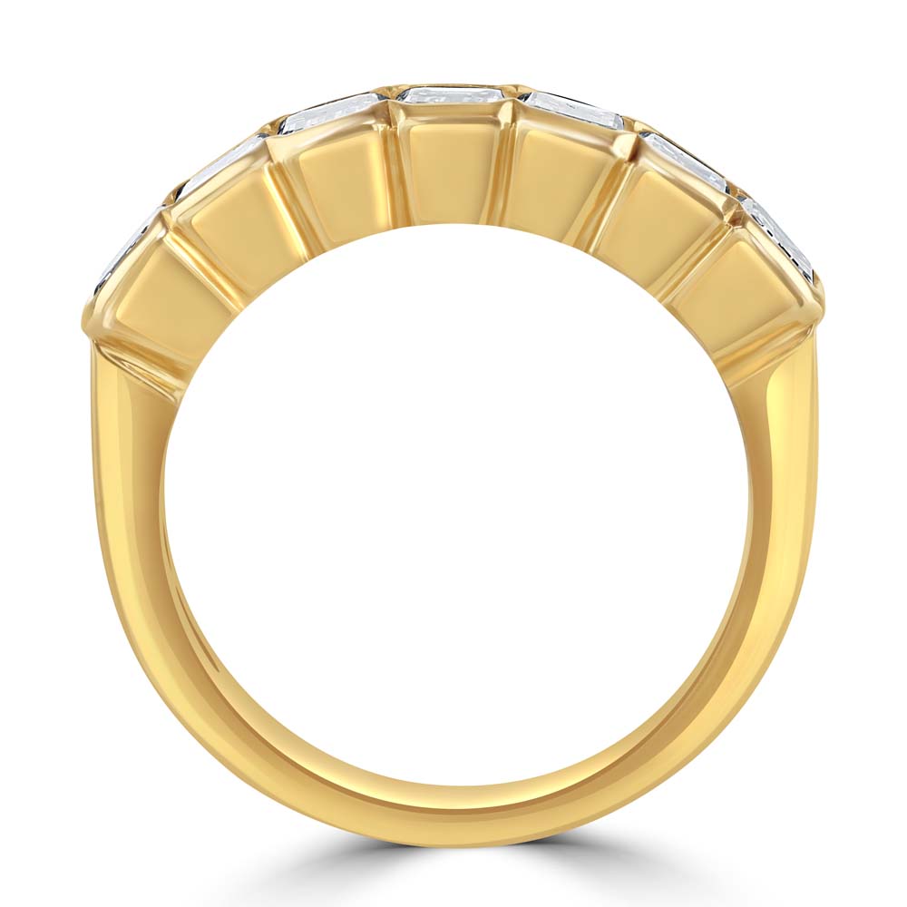 Discover the allure of our 18ct yellow gold half eternity ring, expertly crafted to feature seven breathtaking emerald cut diamonds. Each diamond is elegantly rubover set, ensuring a sleek and modern look. Boasting a total diamond weight of 1.60 carats, this ring offers a brilliant sparkle that will captivate and enchant. Perfect for commemorating special occasions or as a sophisticated addition to your jewellery collection, this yellow gold half eternity ring combines timeless beauty with contemporary design. The rich 18ct yellow gold band enhances the radiant diamonds, creating a luxurious and elegant piece that stands out.