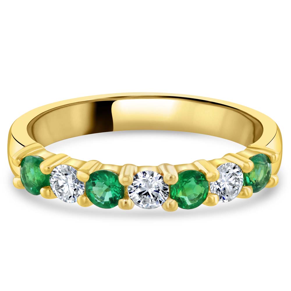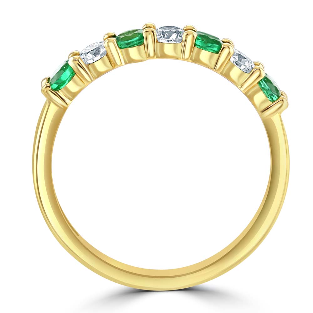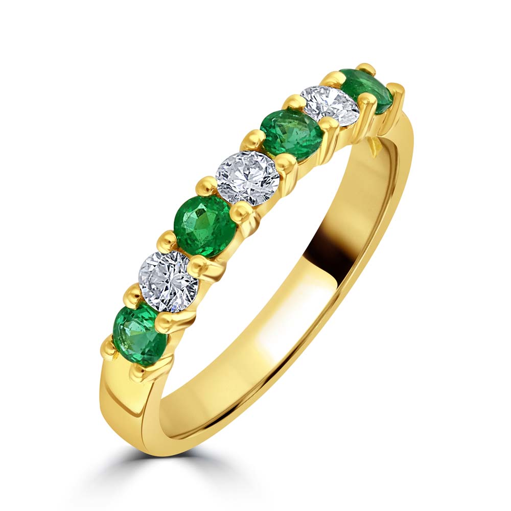 A classic 18ct yellow gold half eternity ring, a masterpiece of craftsmanship and beauty. This exquisite ring features a captivating pattern of alternating four round emeralds and three round brilliant cut diamonds, creating a harmonious balance of colour and sparkle. The total emerald weight of 0.38ct brings a vibrant burst of lush green, symbolizing renewal, and growth, while the diamonds, totalling 0.28ct, add a timeless shimmer that complements the emeralds' radiance perfectly. Each gemstone is securely held in place by four claws, ensuring their brilliance is displayed to its fullest. Crafted in rich 18ct yellow gold, this ring offers a warm and luxurious setting that enhances the natural beauty of the emeralds and the dazzling light of the diamonds. Perfect for those who appreciate the elegance of gemstone jewellery, this half eternity ring is a stunning symbol of love and commitment, designed to be cherished for a lifetime.