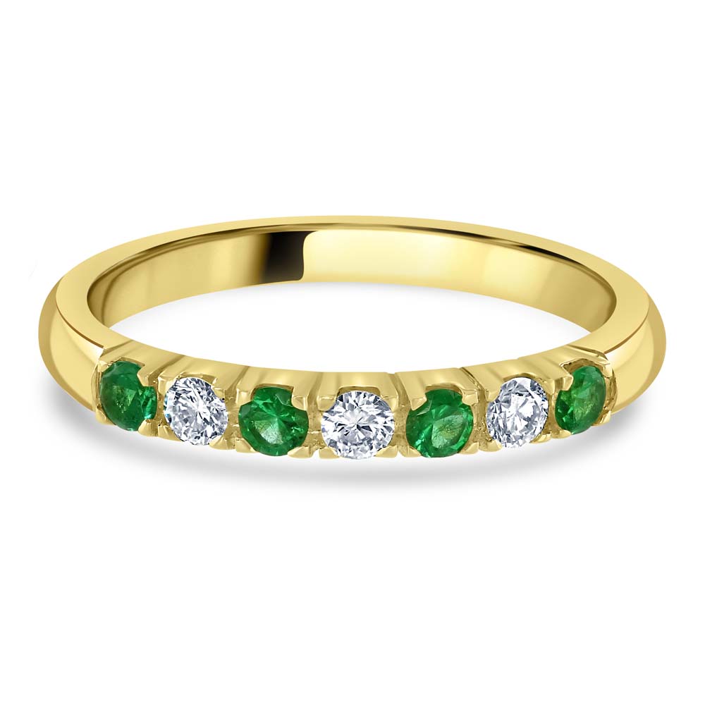 A timeless 18ct yellow gold seven gemstone eternity ring, artistically castle-set with a stunning arrangement of gemstones. This exquisite ring alternates between four vibrant round emeralds and three scintillating round brilliant cut diamonds. The emeralds total 0.17 carats, each stone emitting a lush, deep green hue that beautifully contrasts with the bright sparkle of the diamonds, which collectively weigh 0.15 carats. Perfect for those who value elegance and sophistication, this ring is ideal for special occasions, anniversaries, or as an enduring symbol of love. Its classic design and exquisite craftsmanship ensure it will be a cherished addition to any jewellery collection.