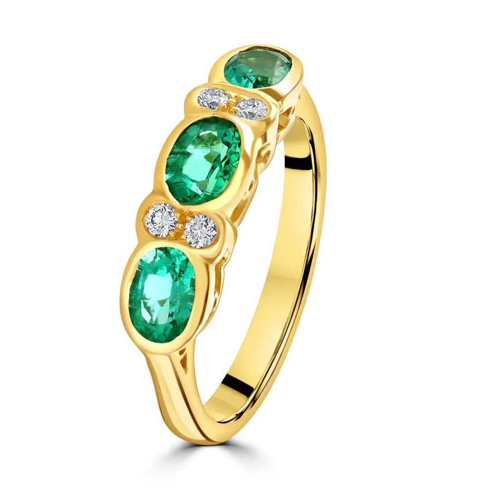 A vibrant celebration of colour and craftsmanship, this 18ct yellow gold ring showcases three beautifully rubover set oval cut emeralds, each radiating a rich, verdant hue. Nestled between the emeralds are two round brilliant cut diamonds, also rubover set, adding a touch of sparkle and refinement to the design. With a total emerald weight of 0.99ct and diamond weight of 0.08ct, graded G for colour and VS2 for clarity, this piece offers a harmonious balance of bold colour and delicate brilliance. The smooth rubover settings enhance the fluidity of the design while providing a sleek, contemporary finish. Elegant and timeless, this ring is perfect for those who appreciate classic gemstones with a modern twist.