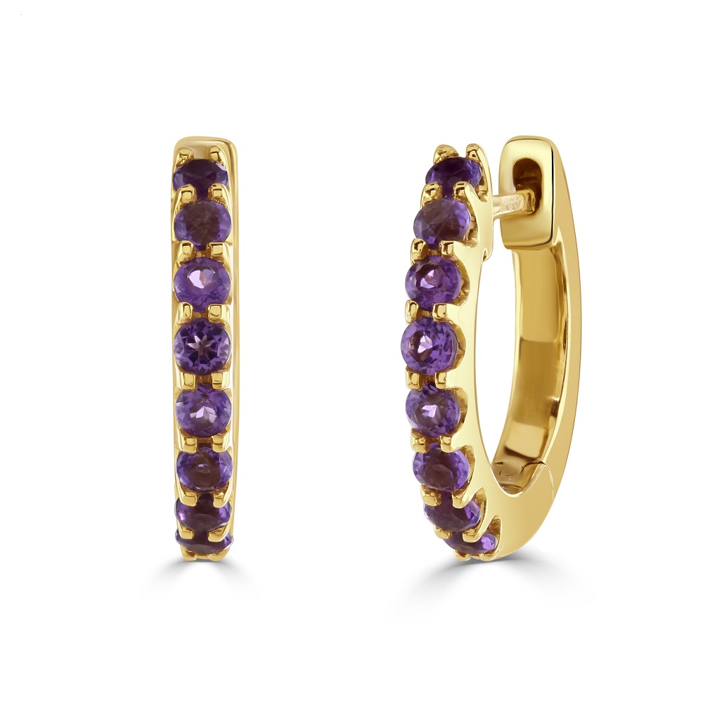 Stunning 18ct yellow gold hinged hoop earrings are adorned with eight meticulously claw-set round amethysts, showcasing a vibrant purple hue that captures the essence of luxury and sophistication. Each amethyst is carefully selected for its clarity and colour, ensuring that these earrings dazzle with a subtle yet unmistakable brilliance. Crafted in luxurious 18ct yellow gold, these hinged hoop earrings combine timeless elegance with modern flair. The hinged design ensures easy wearability and secure closure, making them perfect for both everyday elegance and special occasions. The warmth of the yellow gold perfectly complements the deep purple of the amethysts, creating a harmonious and eye-catching contrast.
