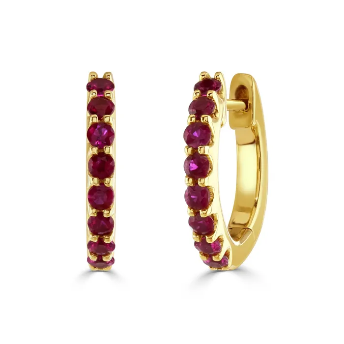 An elegant pair of 18ct yellow gold hinged hoop earrings, meticulously crafted with eight round rubies, claw-set to perfection. The rubies collectively weigh 0.43 carats, radiating a rich, vibrant red that adds a luxurious pop of colour to any look. These earrings feature a secure hinged design that ensures comfort and ease of wear, making them an excellent choice for daily sophistication or special occasions. Whether you are dressing up for an event or adding a touch of glamour to your everyday outfit, these ruby hoop earrings are a timeless addition to any jewellery collection, showcasing classic style with a modern flair.