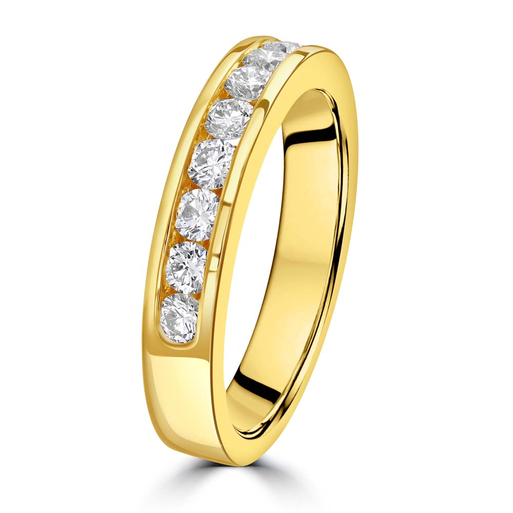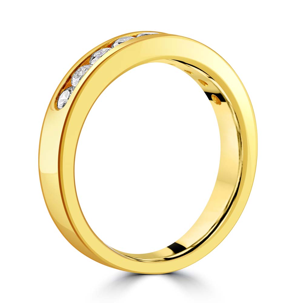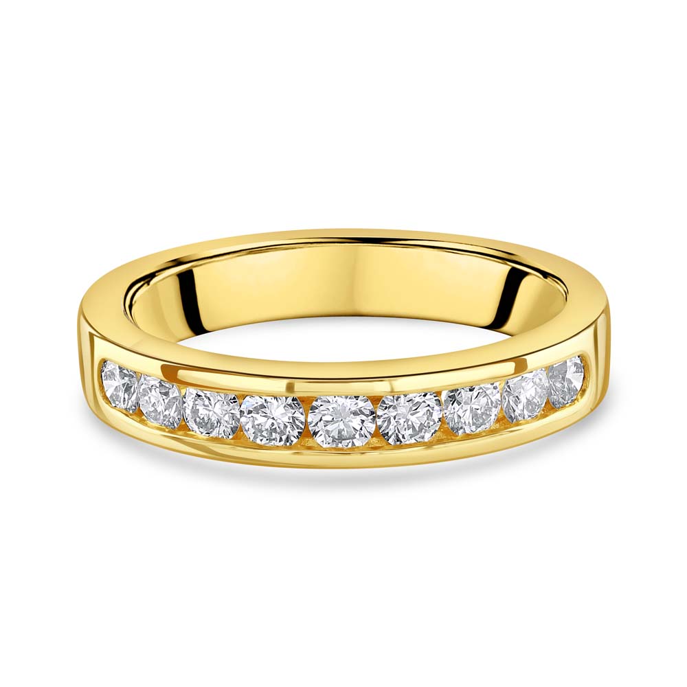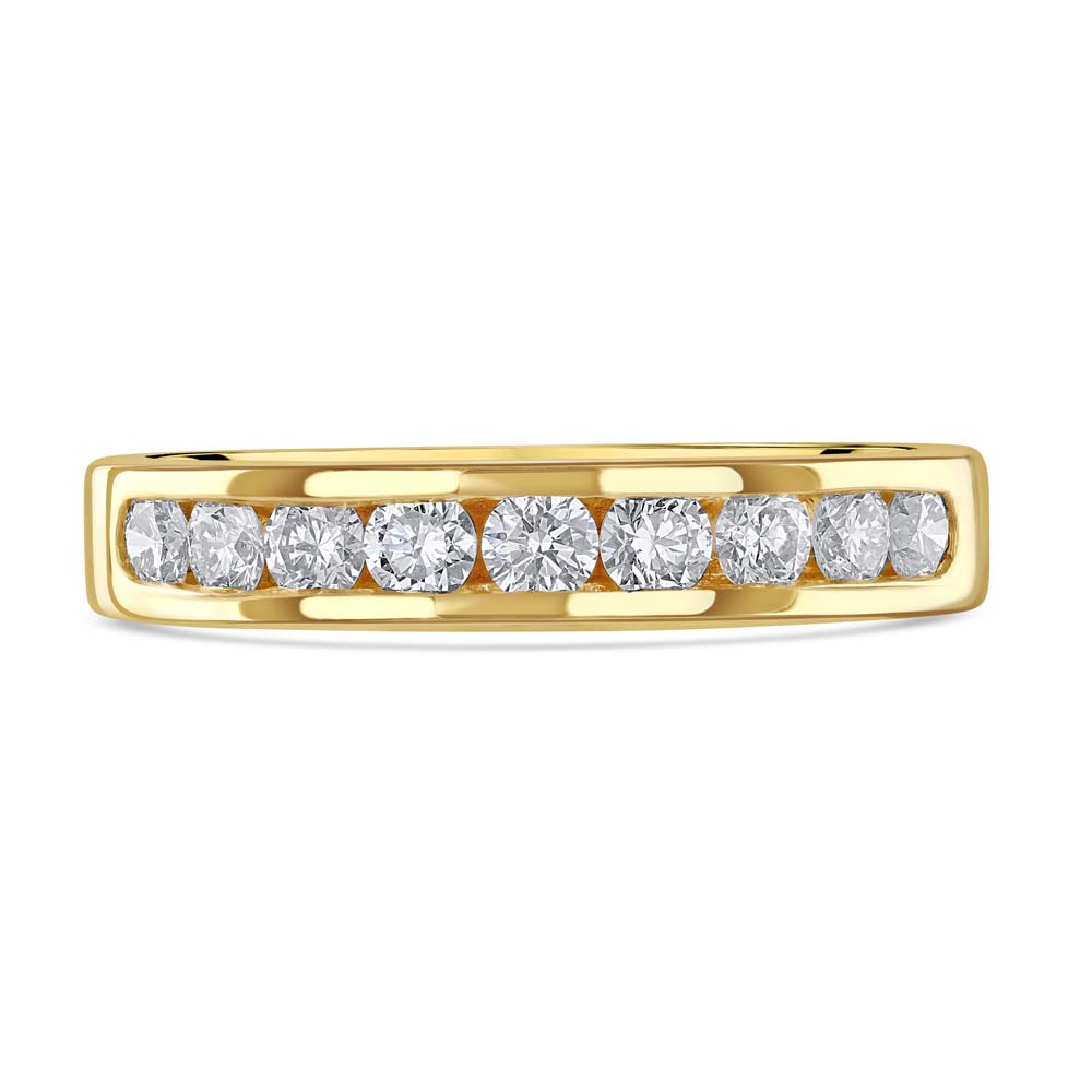 Elevate your jewellery collection with this 18ct yellow gold half eternity ring, featuring nine round brilliant-cut diamonds in a sleek channel setting. Designed for a smooth, contemporary finish, this ring combines elegance with durability, making it perfect as a wedding band, anniversary ring, or a stylish stacking piece. With a total diamond weight of approximately 0.51ct, each diamond is hand-selected for brilliance and quality, ensuring a radiant sparkle that lasts a lifetime.