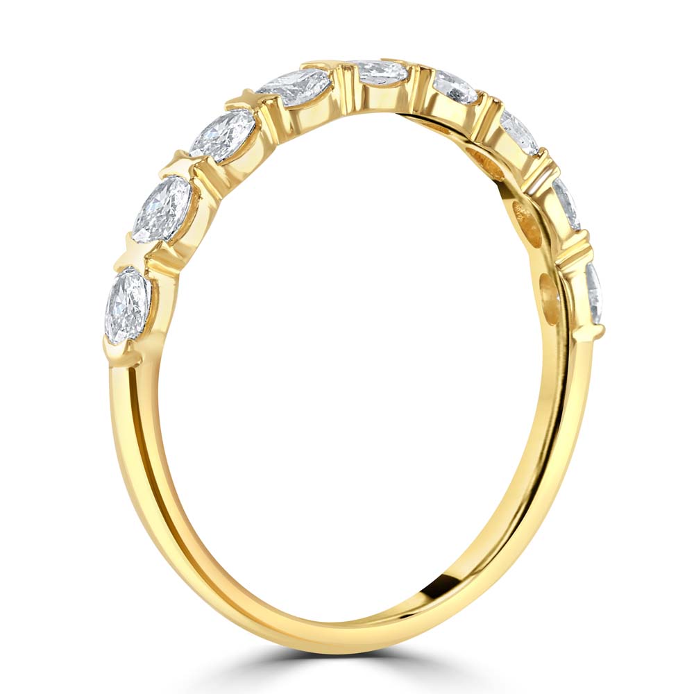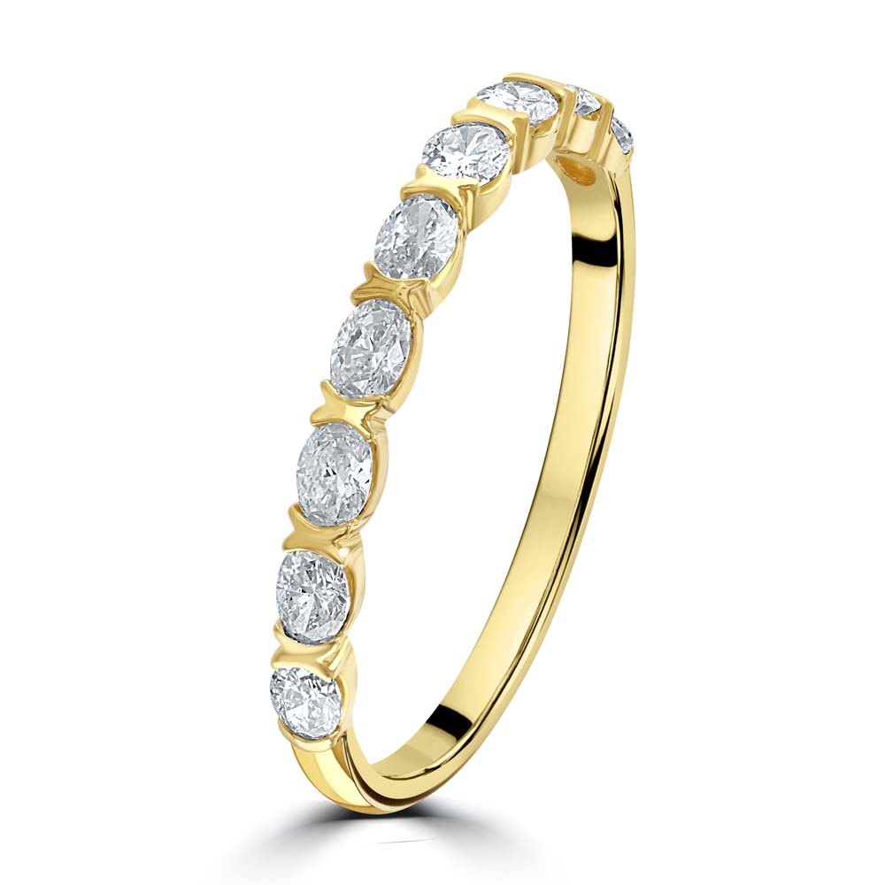 A radiant celebration of timeless elegance, this half eternity ring is crafted in 18ct yellow gold and set with nine horizontally arranged oval-cut diamonds, each secured in a classic claw setting. The unique horizontal orientation of the stones creates a graceful flow of brilliance across the band, offering a modern twist on a traditional design. With a total diamond weight of 0.45 carats, this ring exudes understated luxury and refined sparkle—perfect for stacking, marking a special occasion, or wearing as a symbol of enduring love.