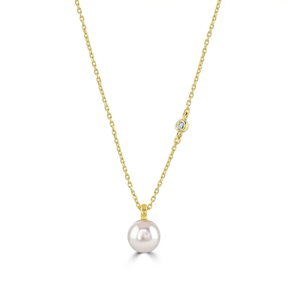 This classic pendant, adorned with Akoya cultured pearl, is perfect to treat yourself and give it as a gift. The sparkle of the diamond adds a touch of glamour.This pendant features a 7.00mm Akoya cultured pearl with 0.02ct of diamonds set in 18ct yellow gold. The chain length is adjustable, from 16" to 18".