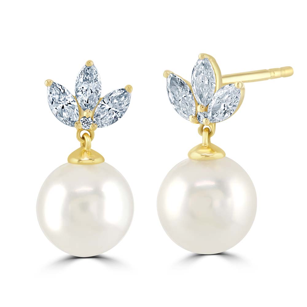 Exquisite 18ct yellow gold stud earrings, each featuring a lustrous Akoya cultured pearl, crowned with a trio of marquise-cut diamond leaves. These premium earrings come with post and butterfly fittings, ensuring a secure and comfortable fit. The combination of radiant pearls and sparkling diamonds makes these earrings a timeless addition to any jewellery collection. These stud earrings perfectly balance the natural beauty of Akoya pearls with the refined sparkle of diamonds, embodying elegance, and sophistication. Whether it's a special occasion or a casual day out, these earrings are sure to enhance any outfit, making them an ideal gift for a loved one or a special treat for yourself.
