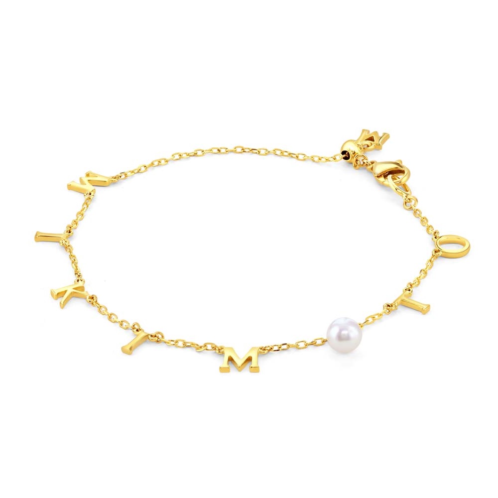 This exquisite adjustable charm bracelet is a distinctive creation from the renowned house of Mikimoto, crafted in 18ct yellow gold. It features a unique design where the iconic letters of 'Mikimoto' are elegantly displayed along the bracelet. In a creative twist, the first 'O' in 'Mikimoto' is replaced with a single Akoya cultured pearl, known for its flawless round shape and iridescent lustre. This pearl adds a touch of classic elegance and serves as a beautiful homage to Mikimoto's legacy in pearl jewellery. The bracelet's slider mechanism allows for easy adjustment, ensuring a perfect fit for any wrist size.