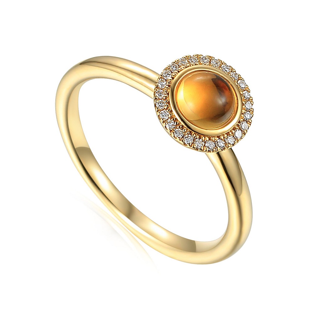 A radiant 18ct yellow gold halo ring, featuring a mesmerizing cabochon citrine, weighing a notable 0.53ct. This exquisite piece is encircled by a halo of 25 delicately claw-set round brilliant cut diamonds that magnify the citrine's golden glow with their sparkling brilliance. Crafted with meticulous attention to detail, this halo ring blends the luxurious warmth of yellow gold with the sun-kissed allure of citrine and the timeless sparkle of diamonds