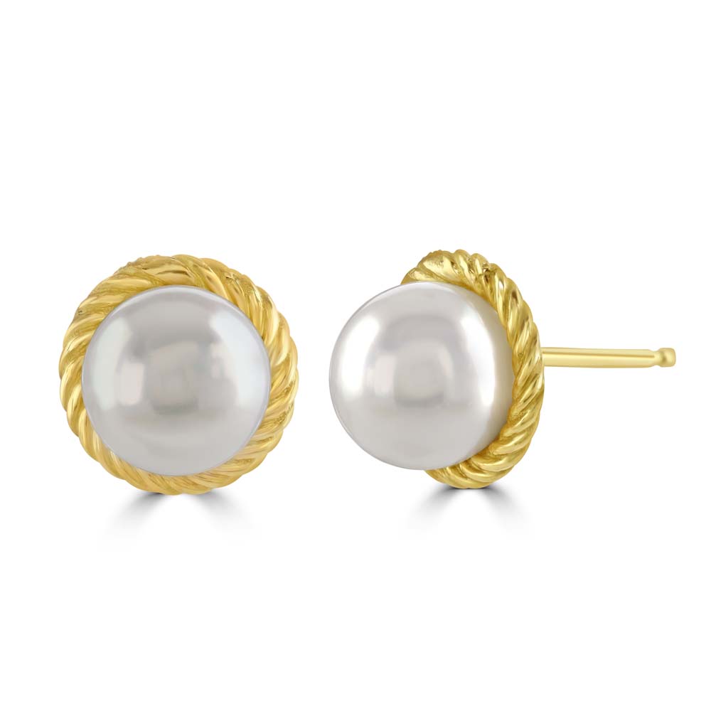 These elegant stud earrings are beautifully crafted from 18ct yellow gold, each featuring a single cultured pearl cradled in a unique rope-edged setting. The pearls, chosen for their smooth luster and perfect round form, are the centerpiece of each earring, exuding a classic and timeless charm. The rope-edged setting adds a distinctive touch to the design, creating a subtle yet eye-catching frame around each pearl.